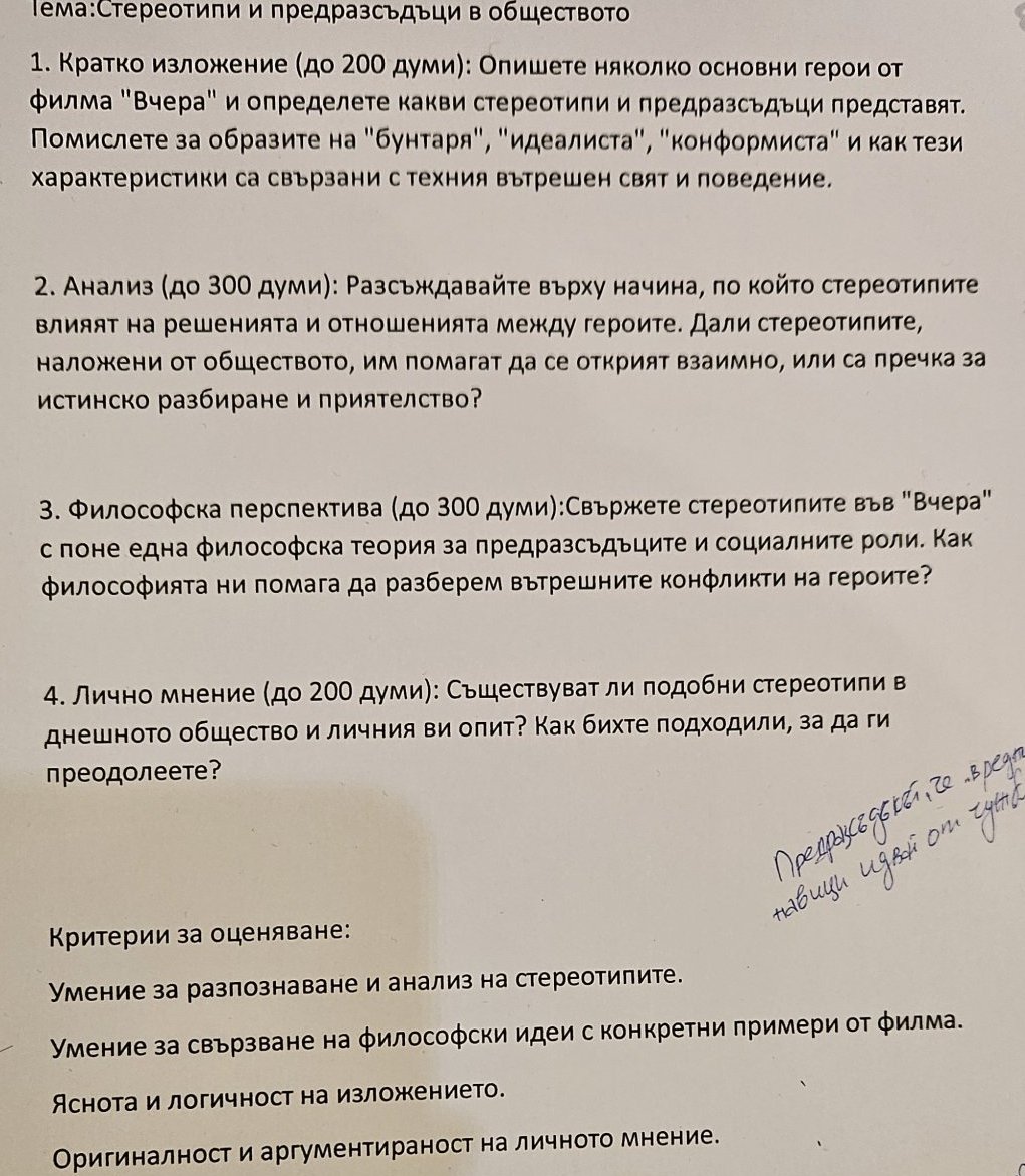 То ясно, че целия клас ще използва ИИ и ще пише едно и също нещо. Въпросът беше и е, че не може да се изисква такова домашно при положение, че не използват учебник и не е преподадено какво е "стереотип", "Предрасъдъци", "социална роля", "философска перспектива"...