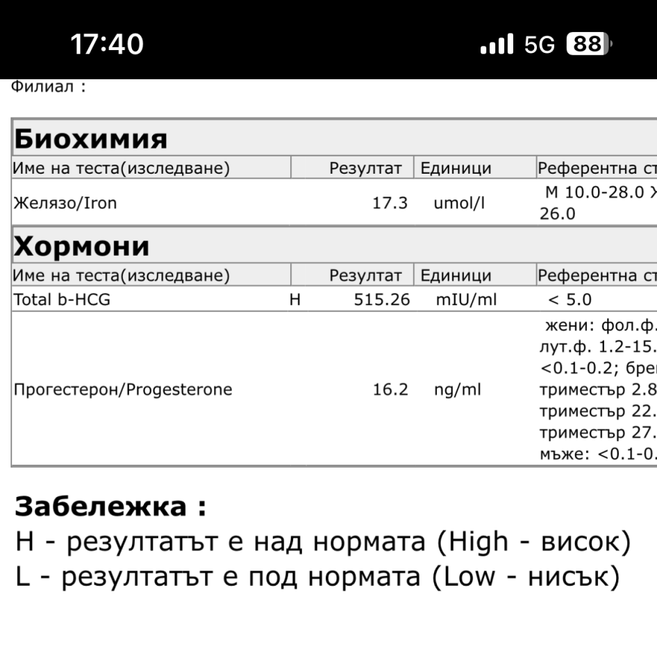 Здравейте, момичета! Включвам се с моя тест от вчера (приложената снимка). В събота чхг беше 173, а прогестерона 20. Удвоява се на 30 часа по калкулатора. Вчера прогестерона е спаднал, но не се усетих, че трябва да е на гладно и отидох по-късно след закуска да дам кръв. Доки ми каза за момента, ако няма болки и кървене да не взимам нищо. Вие какво мислите. Прегледа ми е за другата седмица