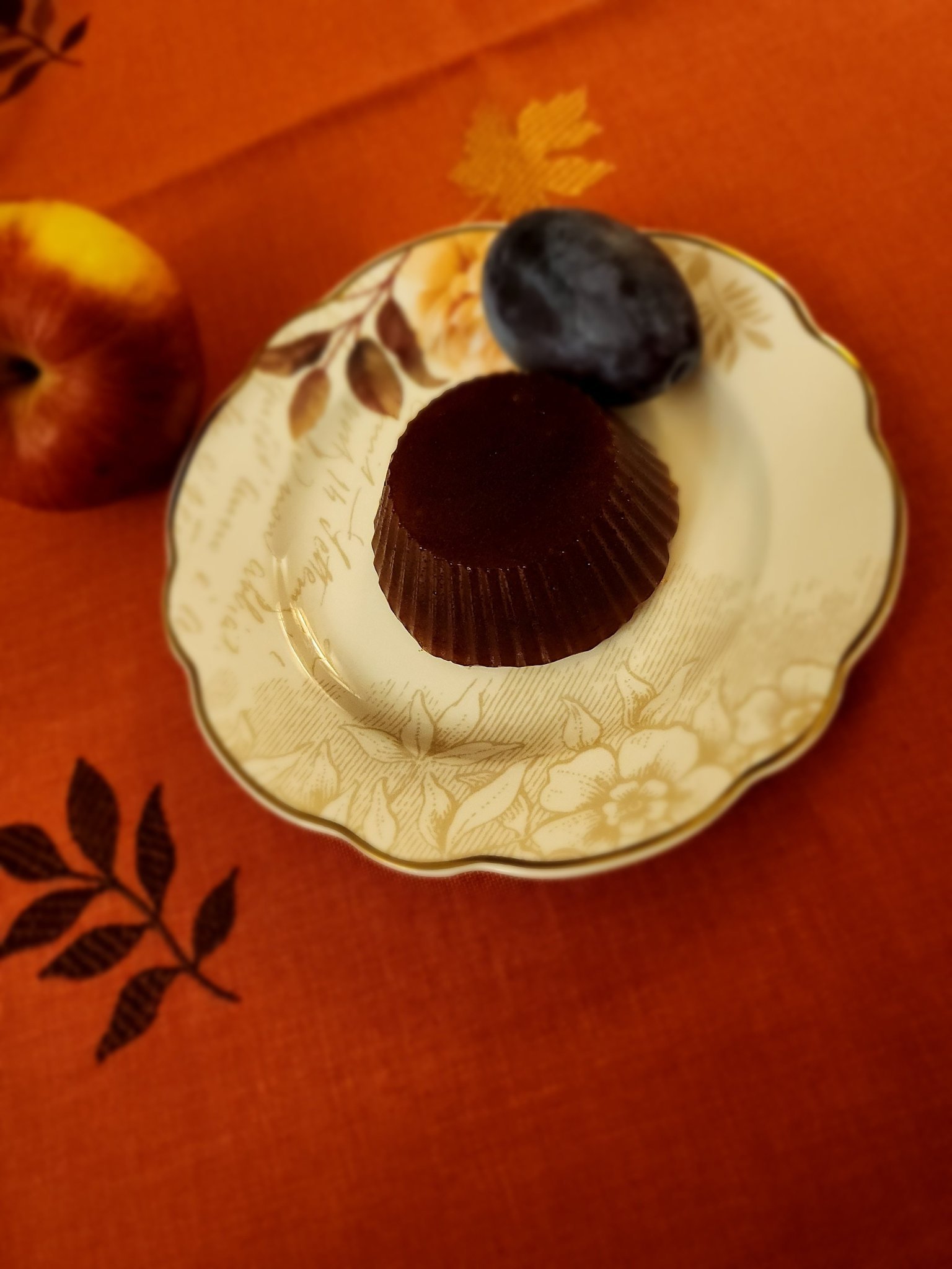 Този път сложих преимуществено ябълки и равни количества круши и сини сливи. Насипах го в бурканчета, но оставих в една силиконова формичка за кексче за бърза проба.