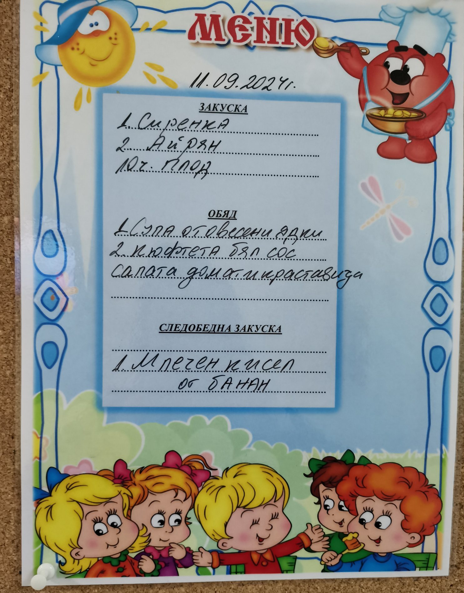 Питам , защото тази сутрин бях потресена от закуската.Пращат ни снимки във вайбър групата как се справят децата в първите си дни,как ядат, играят.....моята още не е тръгнала ,но днес децата ядяха нарязана на хапки филия хляб в купичка и четвърт варено яйце.После ми изпратиха менюто за седмицата - трябва да е било филия с масло(макар че не видях масло) и още три пъти тази седмица ще има филия с масло и домат единия път, айде втория път с шунка и веднъж с масло и конфитюр.Може и заради малкото деца и адаптацията(че нали не ядат мн в началото) да е такава закуската в началото , но си мислех ако може такъв вид спонсорство поне да им обогатят малко закуската с парче сирене или авокадо, половин банан, знам ли и аз.Закуската е най - важното ядене , а толкова бедна....Не , че немога да си я нахраня вкъщи, но нали целта е да свикне там с децата са св храни да социализира...