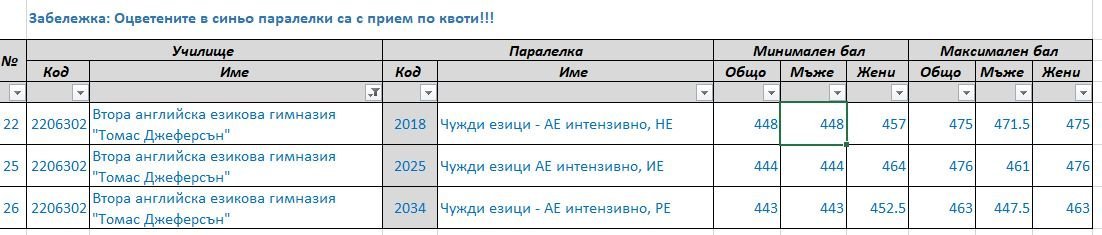 Сега ще разгледам цялата статистика, но досега от баловете, които видях, става ясно по-голям интерес към 2АЕГ за сметка на Първа спрямо миналата година. Но за мен голямата изненада тази година е ФЕГ при момчетата. С изключение на паралелката с латински, при която балът съвпада точно с прогнозата, останалите са с 6-7 точки над прогнозата, каквото отклонение рядко се случва за високобаловите училища. Това говори за значително засилен интерес към ФЕГ от младежите тази година, в сравнение с миналата.