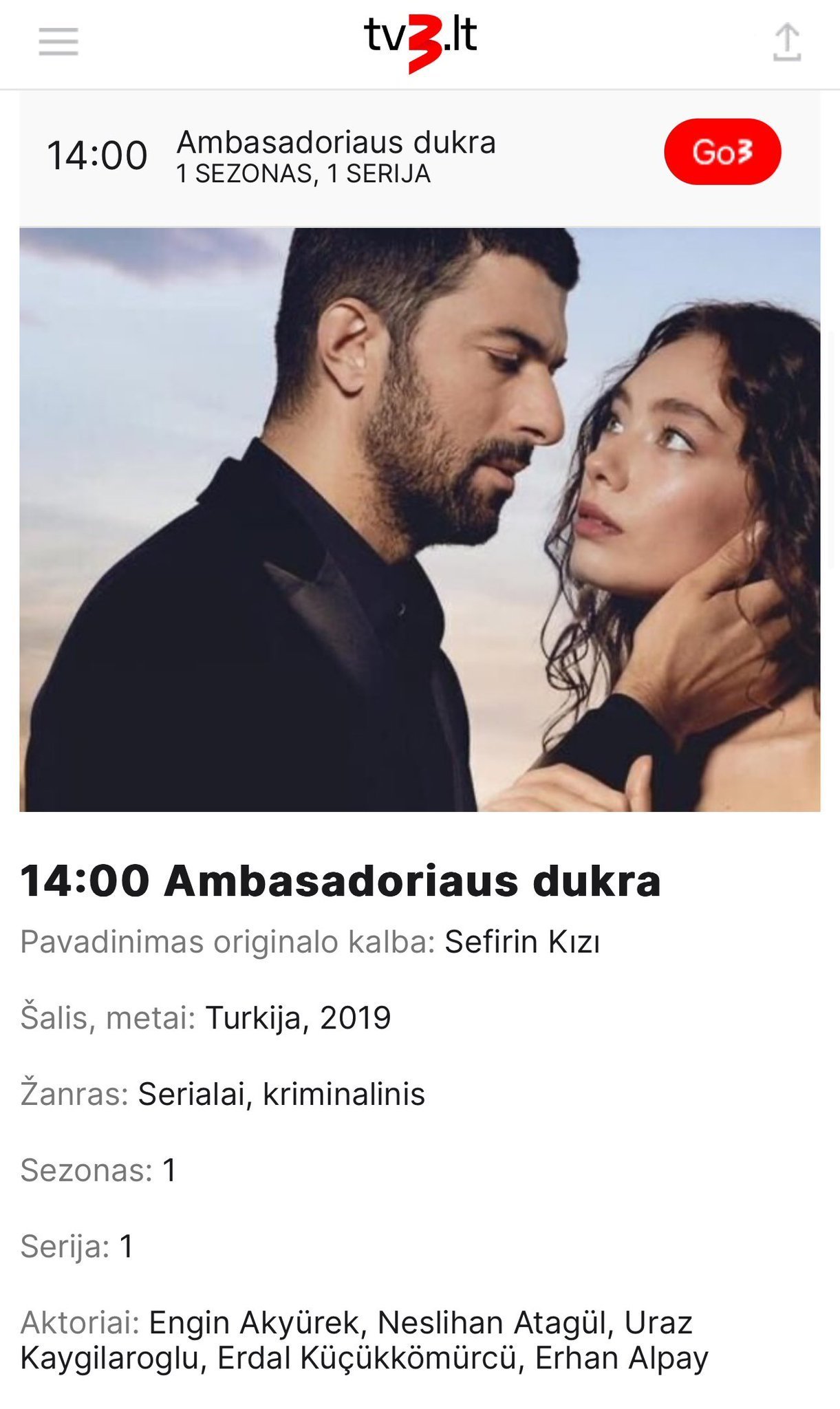 Сериалът "Дъщерята на посланика" с участието на Енгин Акюрек започна излъчването си по TV3 Plus в Литва.