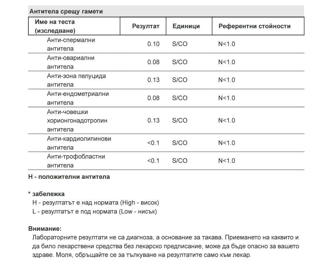 Това са част от изследванията ми, извън спермограма, хламидия, фемифлор и други подобни. Защото ме питате за ембриотоксини и имунологични, горе долу това имам, като даже част от тях не знам какви са точно. Просто са ми наред.