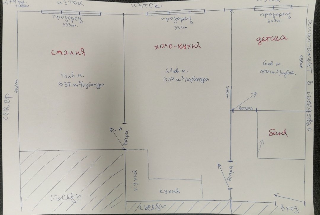 Тухла 60год, хол изток, без изолация, хубава дограма, апартамент София. Точно под хола ни е абонатната станция на парното. Вечно отворени врати между стаите, заради животните.