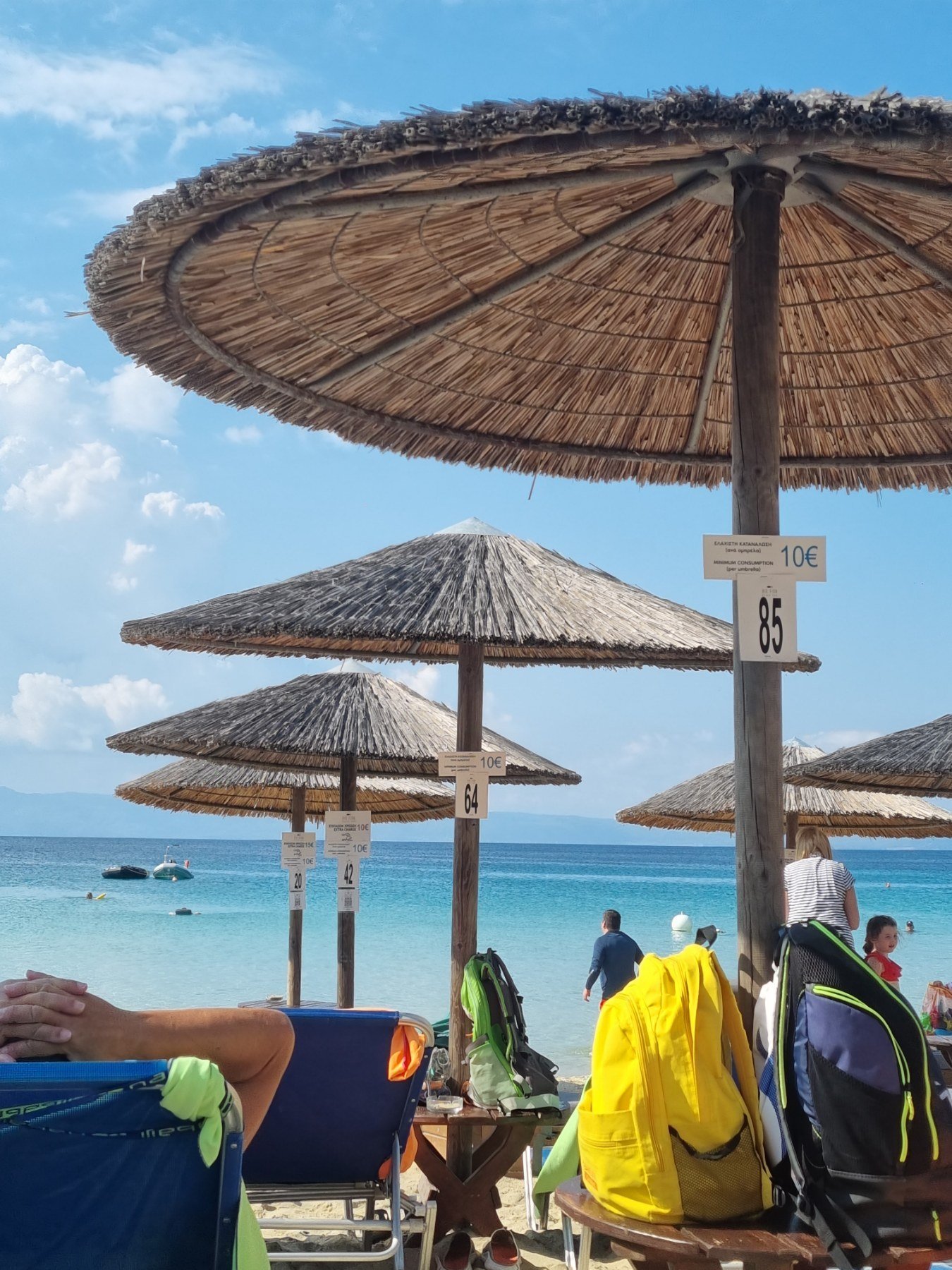 Да дам и моето мнение за Амулияни. Скоро не бяхме ходили в "близката" Гърция , но за инцидентни 4 нощувки решихме, че не си заслужава да ходим по-далеч. Първият ден докато се настаним и хапнем стана 16:00 и решихме с колата на най-близкия и популярен плаж - Alikes. Там беше лудница. Снимах от пътеката зад чадърите цените. Първи ред 15е+10е мин.консумация, втори 10е+10е, а 3 и 4-и ред само 10е консумация за ползването им.