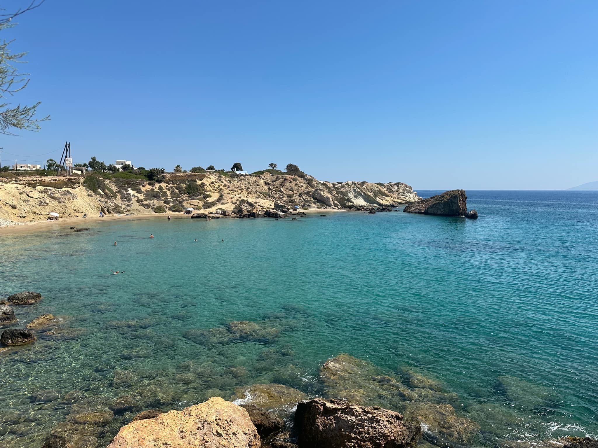 Първия ден посетихме плаж Милос, вървяхме към него по горска пътека през един баир, около 20 минути. Върнахме се с лодка за 4€. Плажът е чудесен! Има малко чадъри със шезлонги, плажната ивица е много голяма. Както и на повечето плажове, във водата бързо става дълбоко. Два дена ходихме до Катизма заради лесен достъп и близостта, изкарвахме там до обяд. Плажът в селото също ми хареса, особено късно вечер, когато хората намалеят. Водата е кристална и има много рибки.