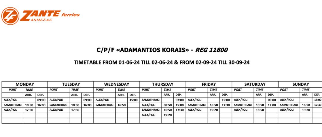 Според сайта на Занте Ферис корабът Адамандиос Кораис ходи и до Лимнос само до 01.09.2024г.