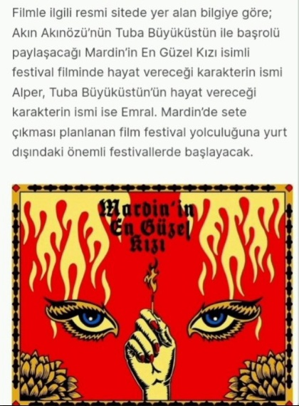 Името на героя, който Акън Акъньозю ще изиграе във фестивалния филм „Най-красивото момиче от Мардин“, в който той ще сподели главната роля с Туба Бююкюстюн е Алпер, а името на героя, който ще играе Туба Бююкюстюн, е Емрал. Филмът, който е планиран да бъде заснет в Мардин, ще започне своя фестивален път на важни фестивали в чужбина.