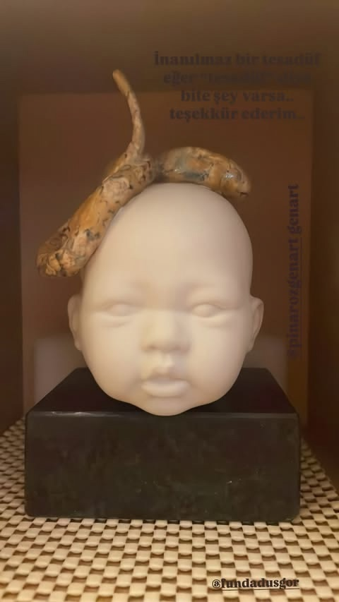 Тази скулптора, която Туба е получила като подарък, на мен лично ми е страховита. Бебешка глава със змия на главата, но аз не съм критерий за  това изкуство. Туба със сигурност  го  е оценила подобаващо. А за какво е гголямо съвпадение, само тя си знае.
