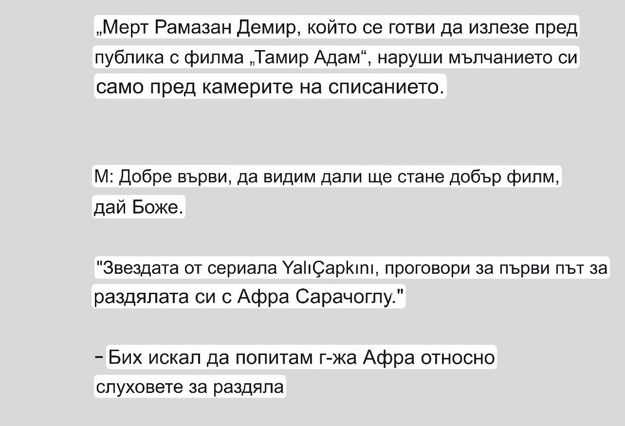 И какво сега появила се нова сценариастка,Мерт и лайкнал снимката ,а феновете решили ,че си търси нова жена  Thinking  Simple Smile  Simple Smile  Simple Smile Не се спират някои хора  с измислиците и фантазиите си и това е   Angry