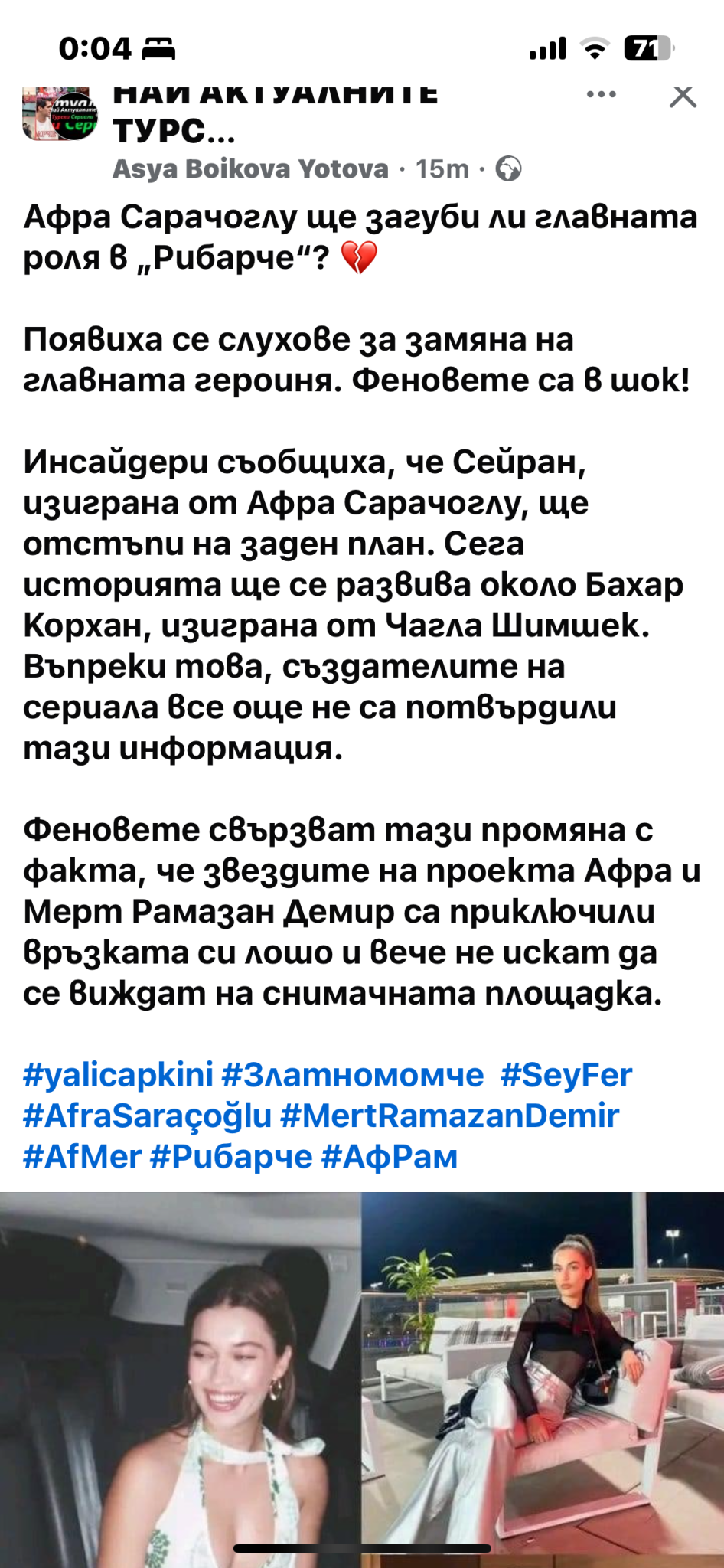 Котката, иска им се на някои хора, ама няма. Афра няма да ходи никъде и никоя не може да я измести. Шнура пробва предния сезон да завърти нещата около Ферит и разни повлекани, но опитите не се увенчаха с успех. Ферит без Сейран е за друг сериал, ако им надържа ахахах. Айде да свършват тази седмица снимките на филма и да чуем нещо за сериалчето ни. Да видим "kimler geldi kimler geçti" Stuck Out Tongue Winking Eye Thank You, Next Grinning