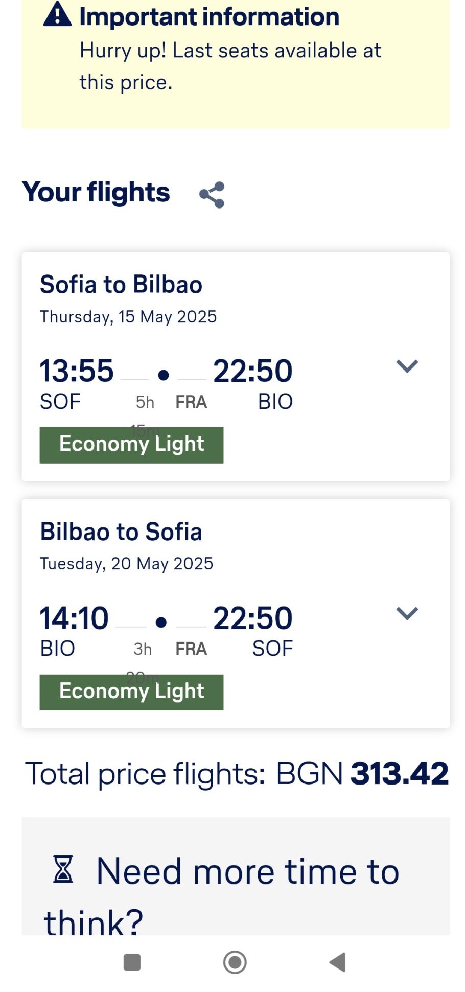 Иначе Луфтханза нямат директен от София до Билбао, само с прекачване. Техните хъбове са в Мюнхен и Франкфурт. За мен беше много удобно, защото още в 10.50 ч. кацнах в Билбао и целият ден беше пред мен.