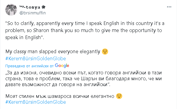„Нека изясня нещо. Очевидно всеки път, когато говоря английски в тази страна, това се превръща в проблем. Така че, благодаря ти, Шарън, за възможността да говоря английски.“