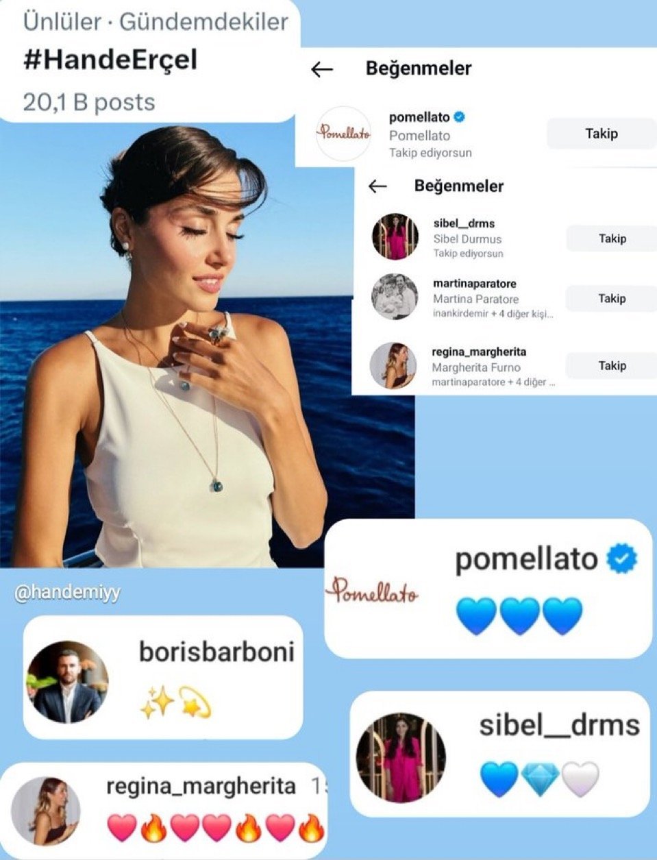 Ханде или е сключила як договор с Помелато да носи техните бижута и да качва снимки с тях, или Хакан сериозни подаръци е правил, или Ханде е инвестирала в бижута. Много ми харесват техните бижута, цените им изобщо.