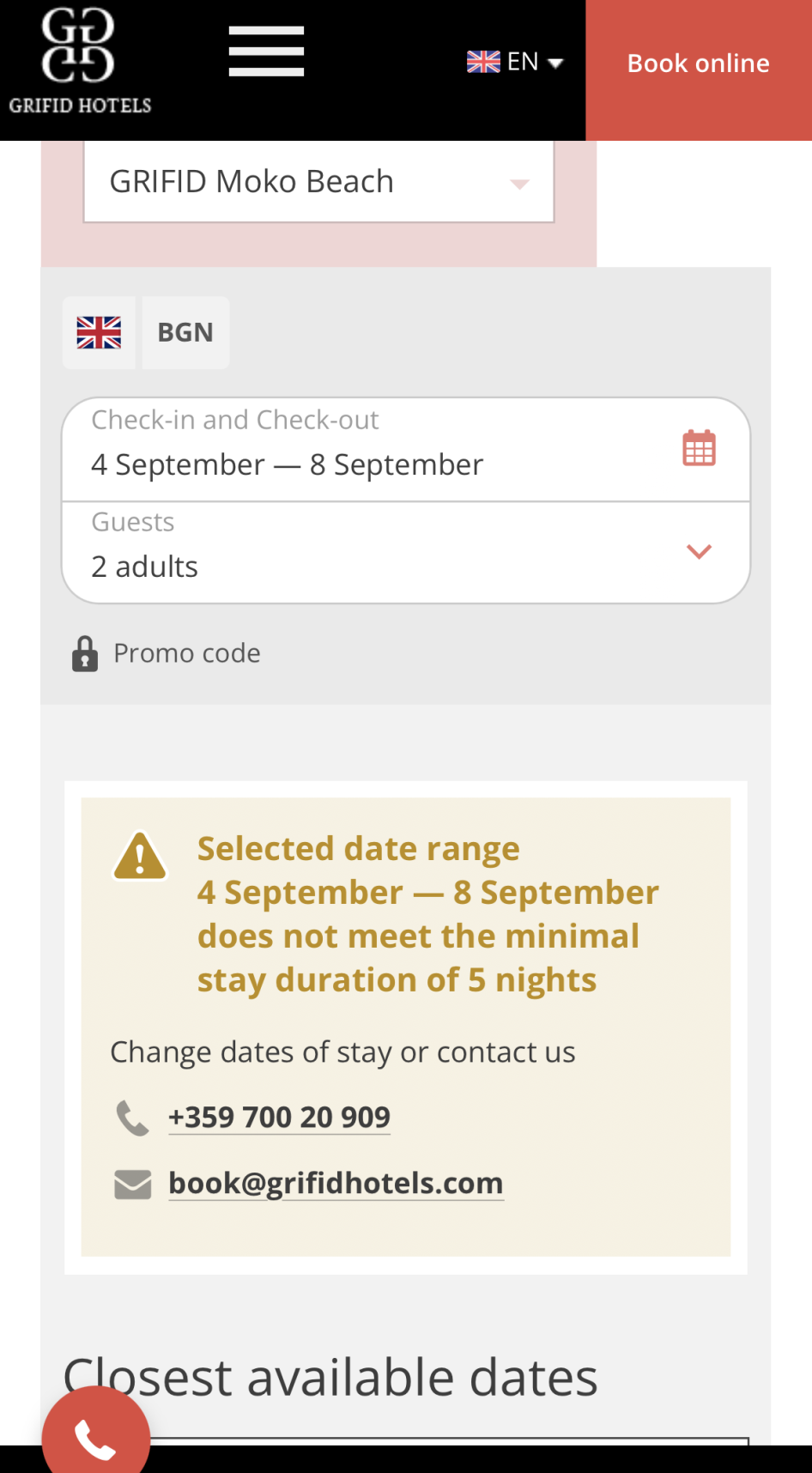 Странно при мен за всички дава мин 5 нощувки. Предполагам по телефона на рецепция биха направили компромис при наличие на свободни стаи.