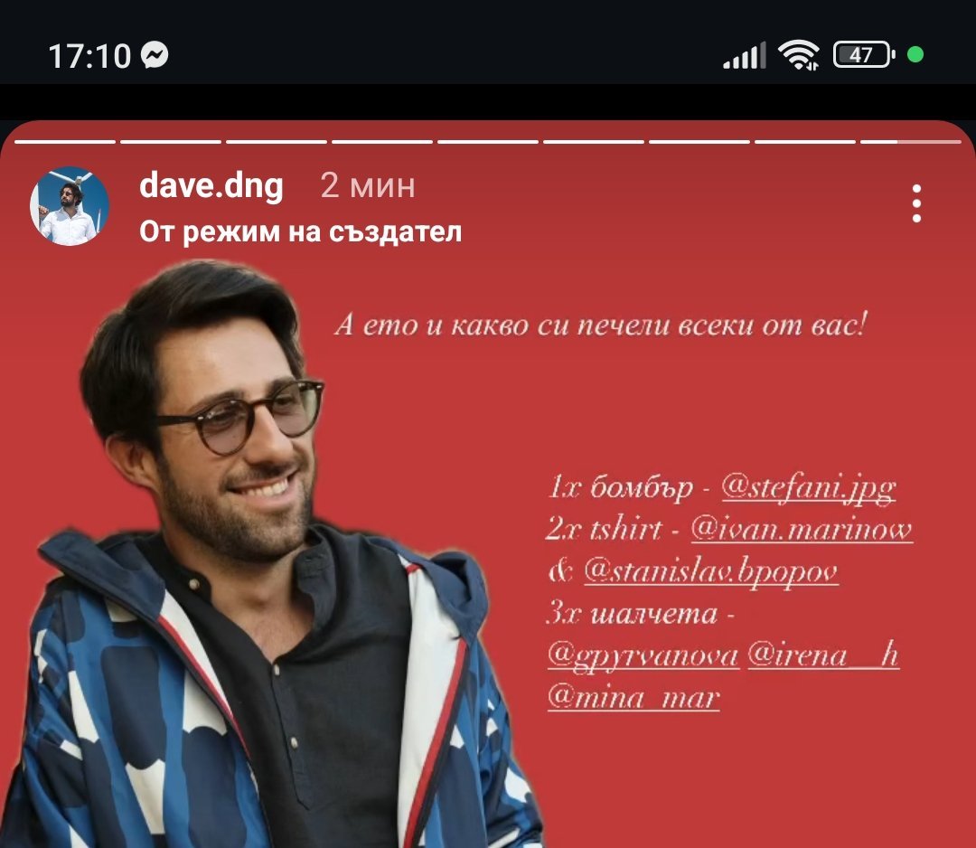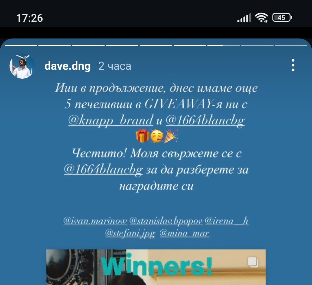 Първо вчера изтегли само един печеливш. Писах му, каза, че днес ще изтегли допълнителни печеливши. Ок. Няма проблем. И днес най-нагло им размени местата. Момичето, избрано вчера от първо изтеглено стана последно. Вместо най-голямата награда - най-малката. Писах на Dave  да си изкажа възхищението. И на момичето, изтеглено вчера да си търси правата! Дано си види съобщението.