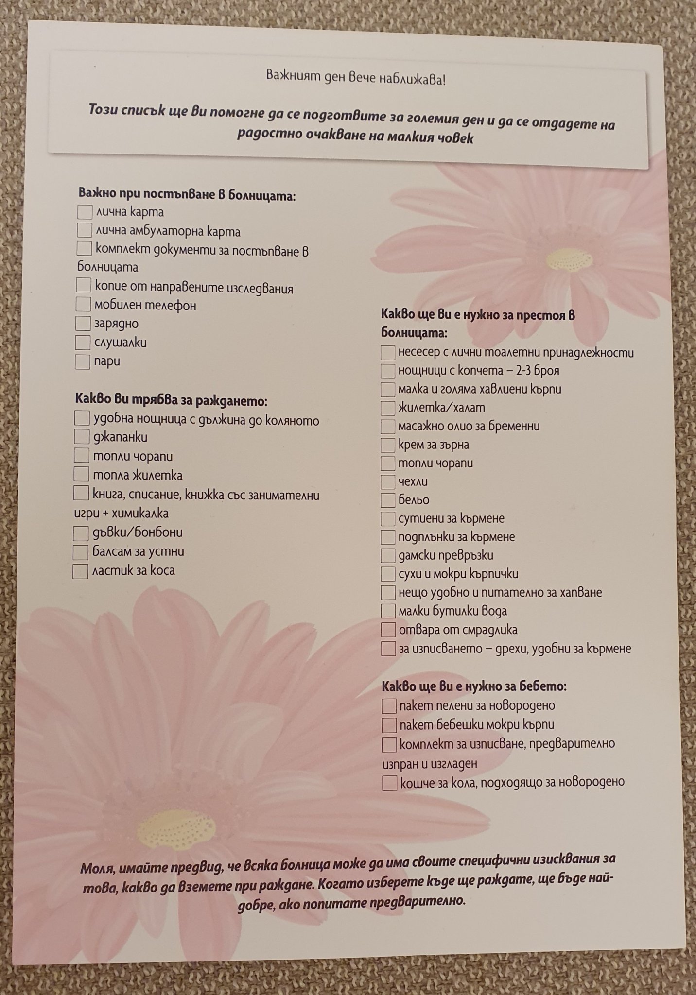От миналата седмица ходя на курс за подготовка за раждане - казаха непременно да се вземат някакви сладички/любими неща за хапване в болницата. През деня всичко имало, но ако е нощ е добре да сме запасени с това, което искаме. Другите неща вече ги споменахте, така че нищо ново. А, и музика - тук имало само мелодии на птиче чуруликане, та ако сме искали нещо по-hardcore и мотивиращо: да си го донесем.