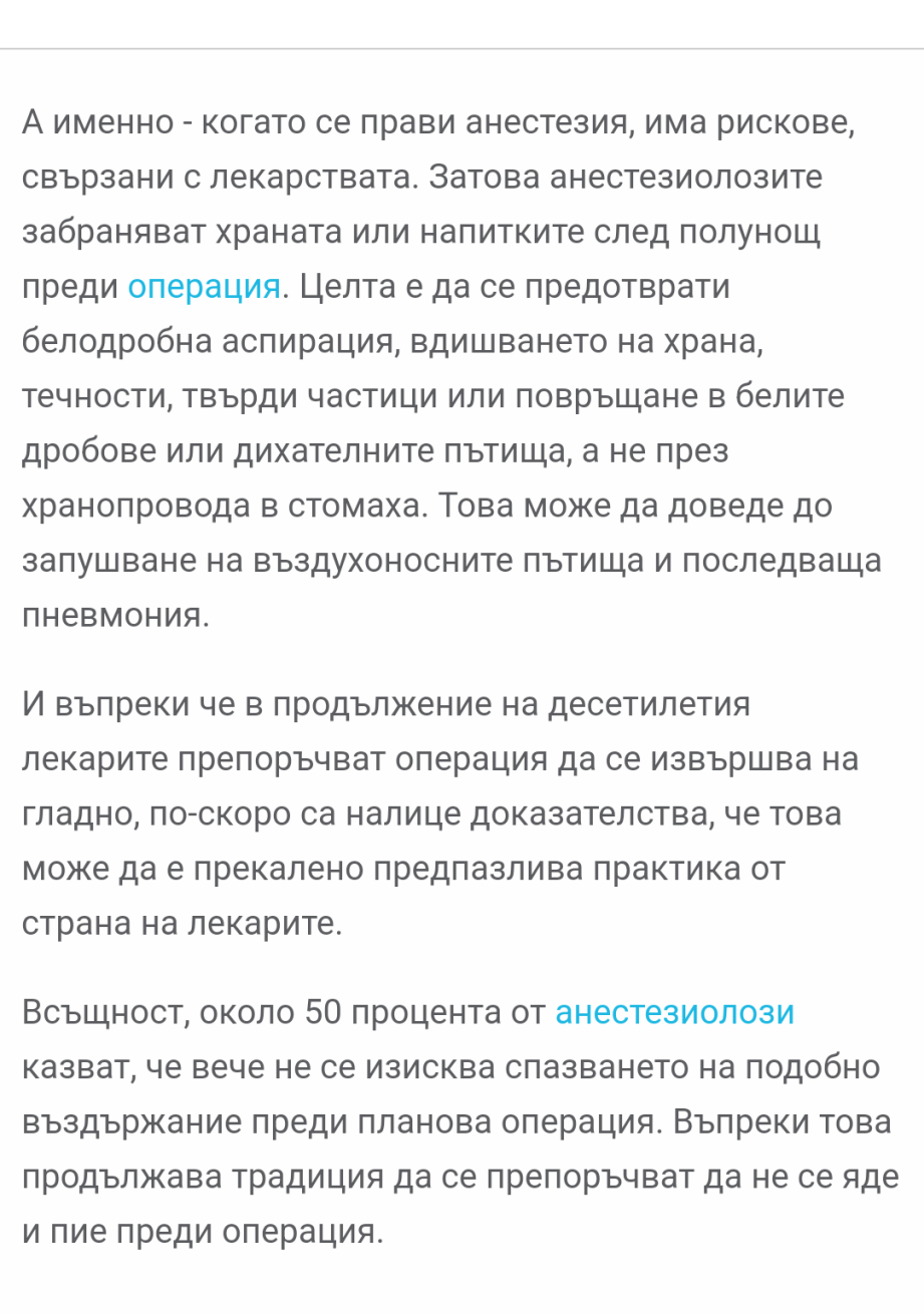 Ако си гладен и жаден те хваща упойката. Отделно след храна и упойка може да се стигне до повръщане. Затова лекарите имат препоръки. Те не са да ни е гадно.