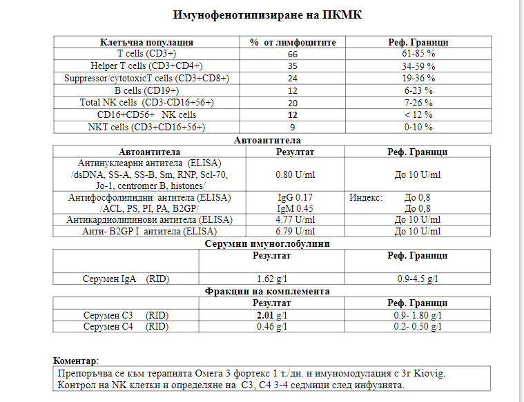 Пуснах Репродуктивен скрининг панел в Надежда, който не мога да разбера какво съдържа, фракция на комплимента С3 и С4, антикардиолипинови антитела и anti b2gp1 антитела. Довечера се очаква да ми излязат резултатите и ще ги кача, за да се види по-подробно какво има в този репродуктивен панел. И после ще попълвам каквото е изпуснато. Искам да си направя всичко, което се прави още преди аборта. ЧХГ-то ми беше почти 13 000 в понеделник, на много прогестерон съм все още, не съм го спряла (сигурно в петък ще ми го спрат) и се притеснявам да не изпусна нещо.