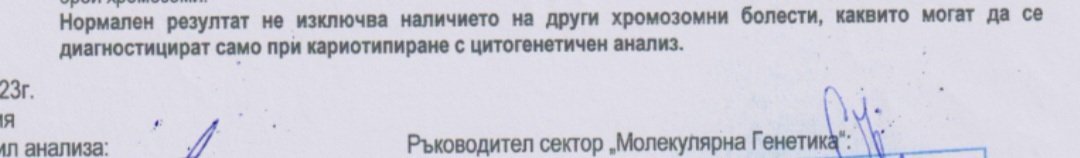 Сега си проверявах последното изследване в Геника. Десет хромозоми изследват в пълния пакет. И отдолу изрично пише това, което и Дели казва: