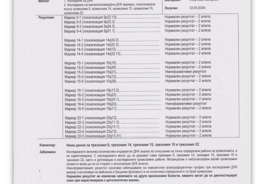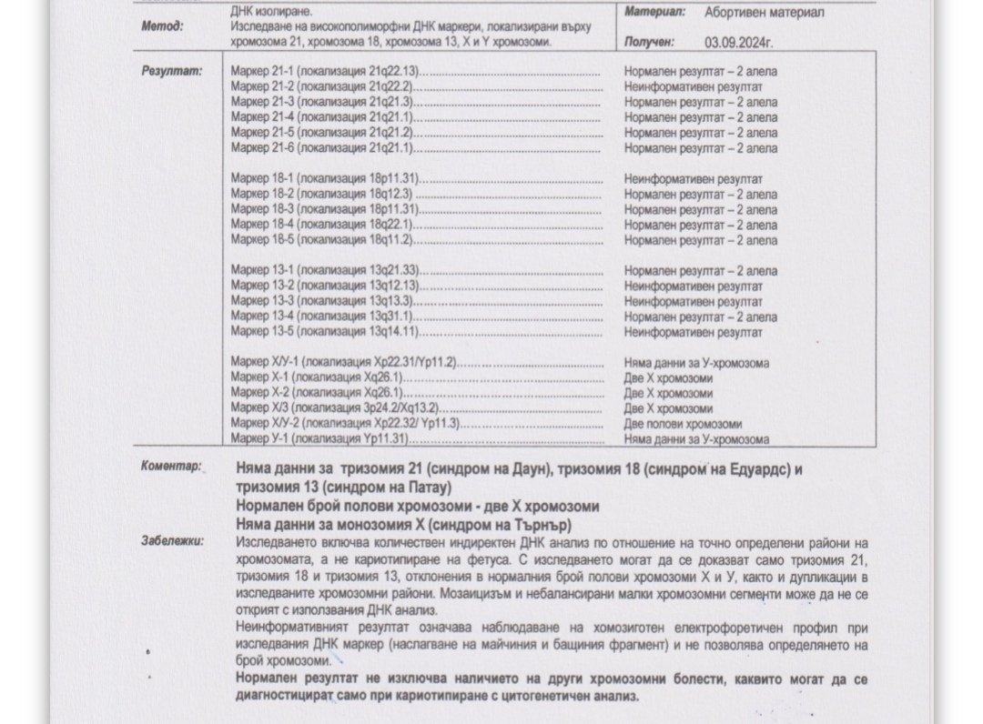 Меги, то си пише долу в забележка за неинфирмативния резултат. Има наслагване на майчината и бащината ДНК и не може да се каже категорично нормален брой ли са хромозомите или не. Няма данни за отколонения в изследваните хромозоми, но това не означава, че в останалите всичко е наред.