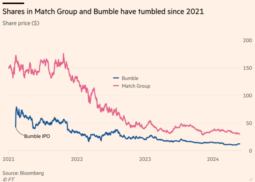 Известна е и на мъжете, които все по-малко се навиват да плащат за ап, където има 80-90% мъже. Приходите и печалбите падат, а ето какво става с акциите им - паднали са 80% последните години, а на Бъмбъл наскоро паднаха с още 25% за един ден, когато изкараха лош отчет за тримесечието миналата седмица:
