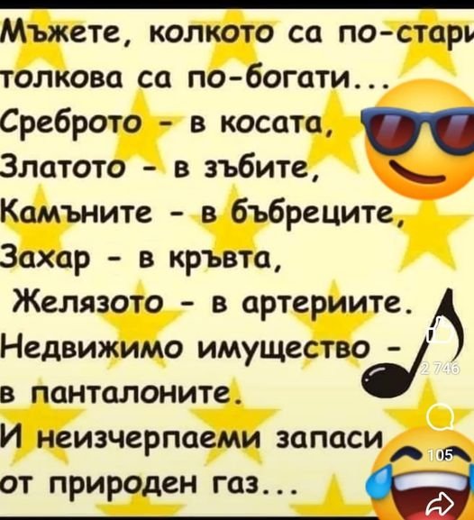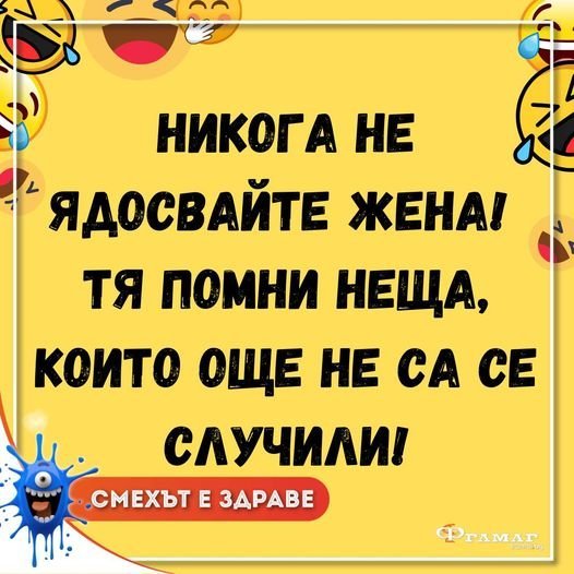 Реклама по радиото: – Чувствате се остаряла? Грозна? Дебела и непривлекателна? Няма страшно! Подарете бутилка водка на мъжа си, и веднага ще си върнете предишната младост и привлекателност!