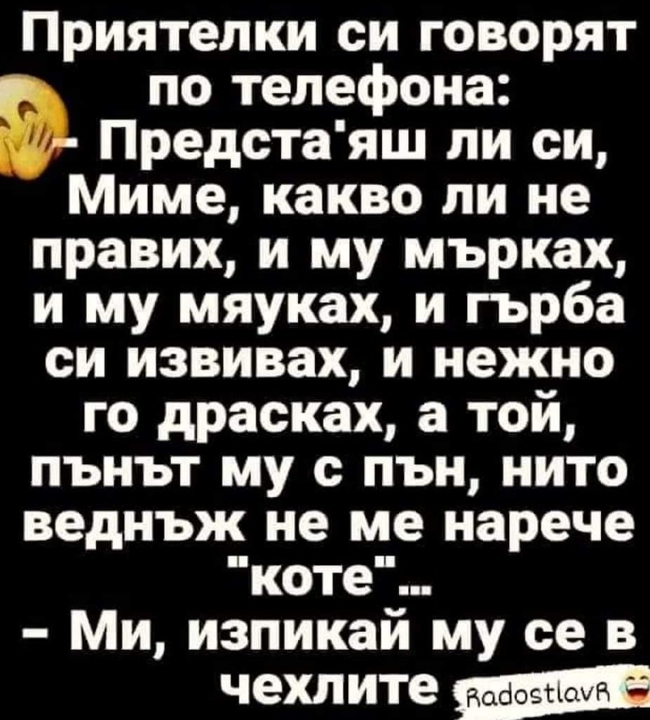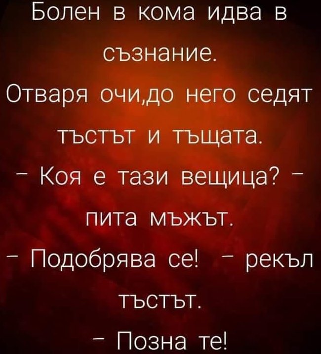 Един мъж се подготвял да гледа боксов мач, ама много як и интересен мач, със страховити боксьори. Накупил бири, ядки, проверявал програмата няколко пъти, абе голяма подготовка. Става време и мачът започва. Няколко размени на удари и в 27 секунда, единият пада в нокаут. Човека възмутен, пуска в действие българския речник - ма до девето коляно. Жена му стояла на вратата и го гледала.