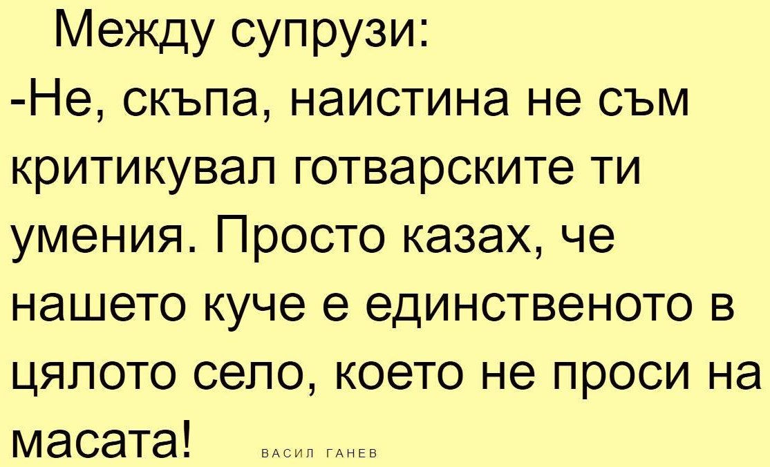 - Пешооо, Пешо! Ела бързо, да видиш жената на оня тъпанар, дето ти се е изпикал снощи в саксофона...