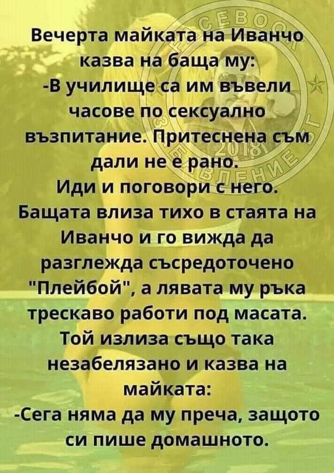 😂 😂 😂 Като млада булка бях решила да правя ориз на фурна (печката на дърва - 1983 година). Да уточня - не можех да готвя, не можех да плета, нищо домакинско не ми се връзваше, с две думи ентусиазиран участник в кръжок: "Извадете кунки от гъзунки"... Та сложих тавата върху печката отгоре да запържа ориза. E да, но мазнината опльока цялата печка (свекърва ми беше фанатик на тема чистота). Мислих как да залича дирите и ми дойде наум да изсипя, както гори печката бронз отгоре й.... Та като пламна туй ти нещо! Навсякъде стана пръски бронз по килима. Гледам таванът черен. Айде, тавана свекървата, си викам, ще го преживее, ама килима. Изнамерих в килера една четка (де да знам, че имало и телени четки) и започнах да дращя килима, да го чистя, а то по-голяма беля - разнищих го, все едно молци банкет са си правили посред зима. Спомням си, че жената стоеше вцепенена по средата на стаята, когато се прибра от работа и ни дума, ни вопъл, ни стон. Викам си: "Ще припадне"! След малко сама се успокоявам : "Страх, лозе пази - смее ли да припадне, като знае КОЙ😁 ще й окаже в момента първа помощ?"😂 😂 😂