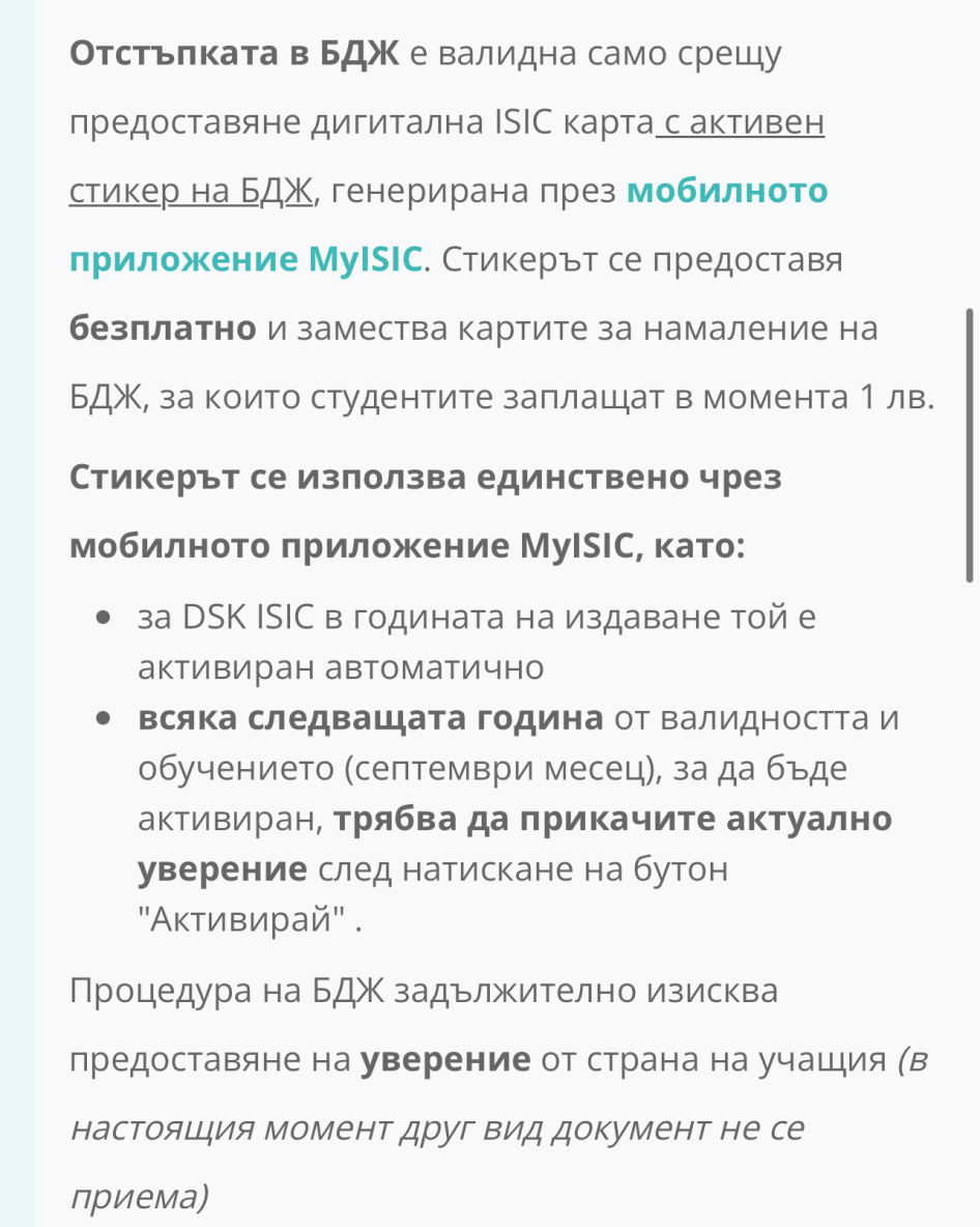 За БДЖ намалението важи само с онлайн приложението ISIC. Пластмасовата карта пластика не важи.
