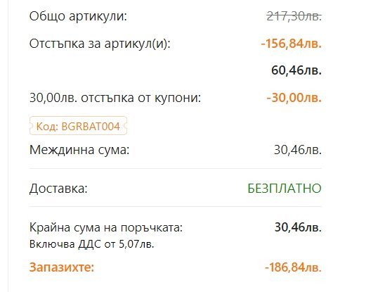 На 4 артикула , които на редовна цена са между 40-50 лв. така намалени, веднъж на промо и после с купон, средна цена идва под 8 лв.