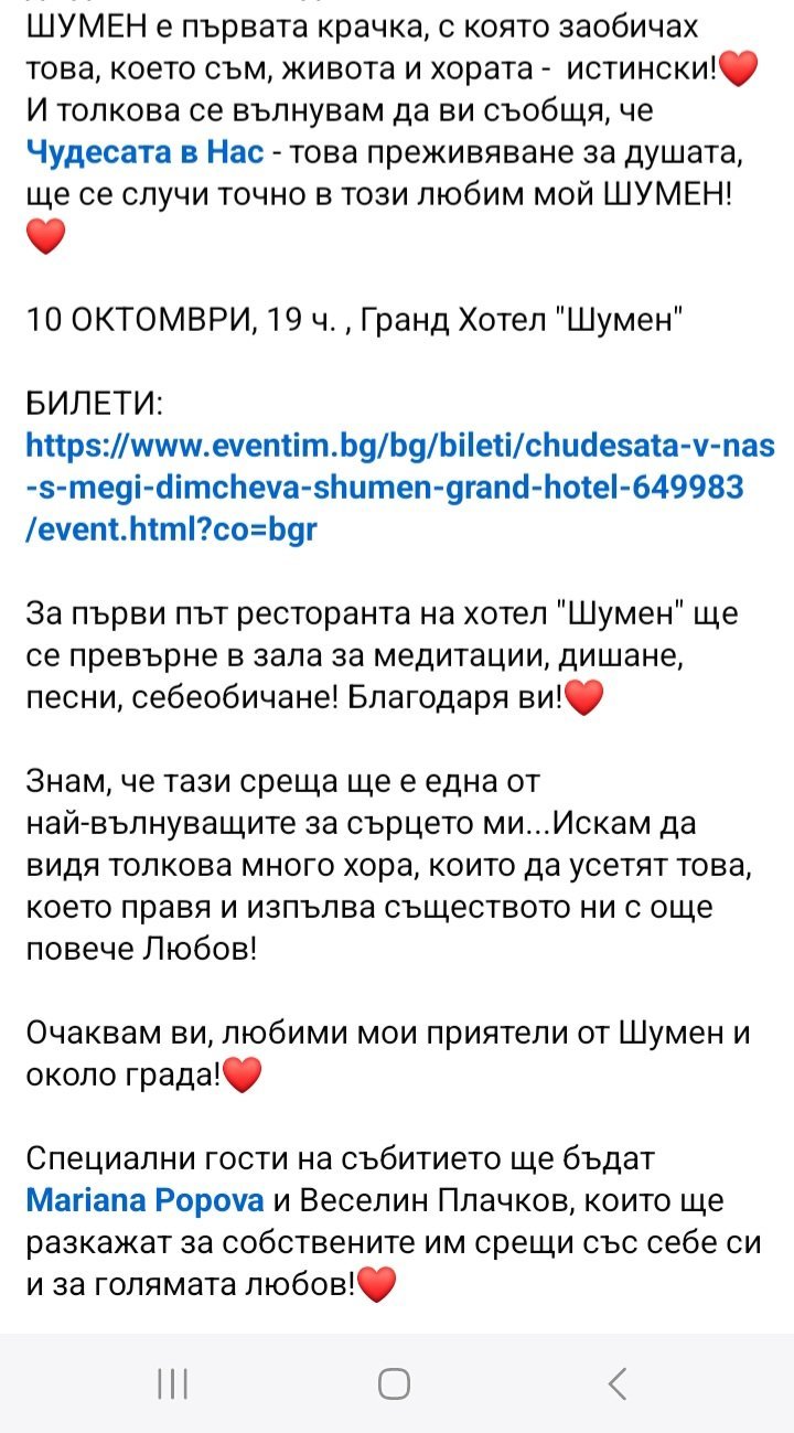 Меги от "Търси се" презентира началото на свое събитие. Някой има ли идея какво ще да е това чудо с медитация, дишане и себеобичане и с гости М. Попова и Плачков?