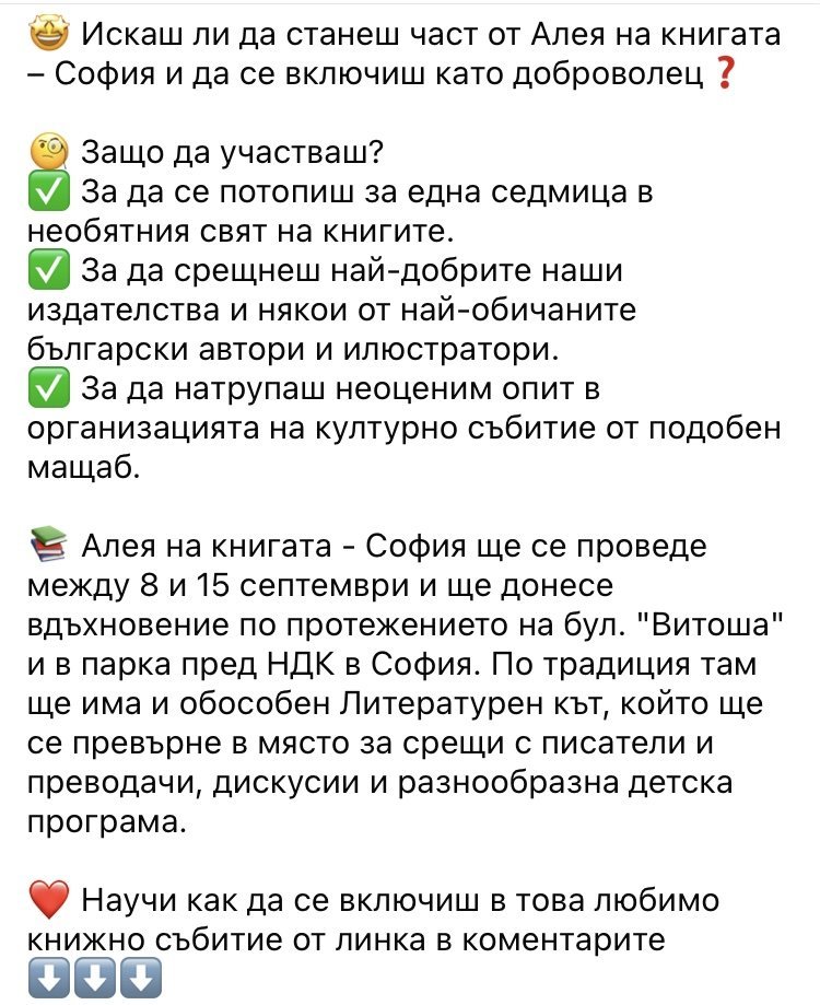 Всеки септември месец в София има Алея на книгата. Почти всички издателства са софийски и си имат разни офиси и складове, по-лесно извозват и прибират книгите. А хората от шатрите и щандовете живеят в София и сутрин лесно стигат в 10.00, вечер се прибират вкъщи. Ако Алеята е например в Пловдив, трябва да спят по хотели, а книгите да ги извозват от София. Това ми обясниха веднъж от “Емас” (не съм сигурен дали бяха те) като ги питах защо не участват на пловдивския панаир на книгата. Ама то важи за всеки друг де.