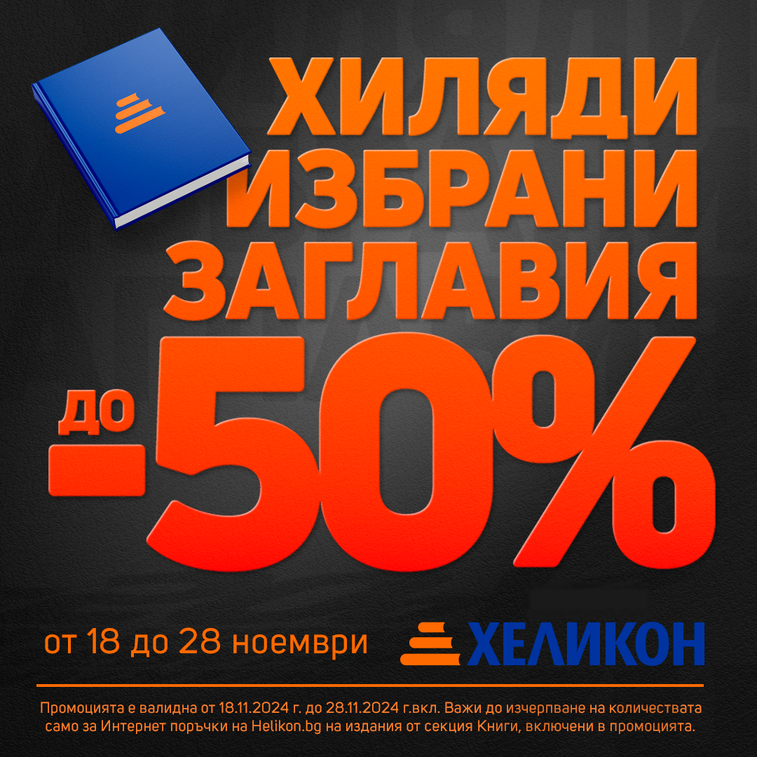 Промоцията е валидна от 18.11.2024 г. до 28.11.2024 г. вкл. Важи до изчерпване на количествата само за Интернет поръчки на www.helikon.bg на издания от секция Книги, включени в промоцията.