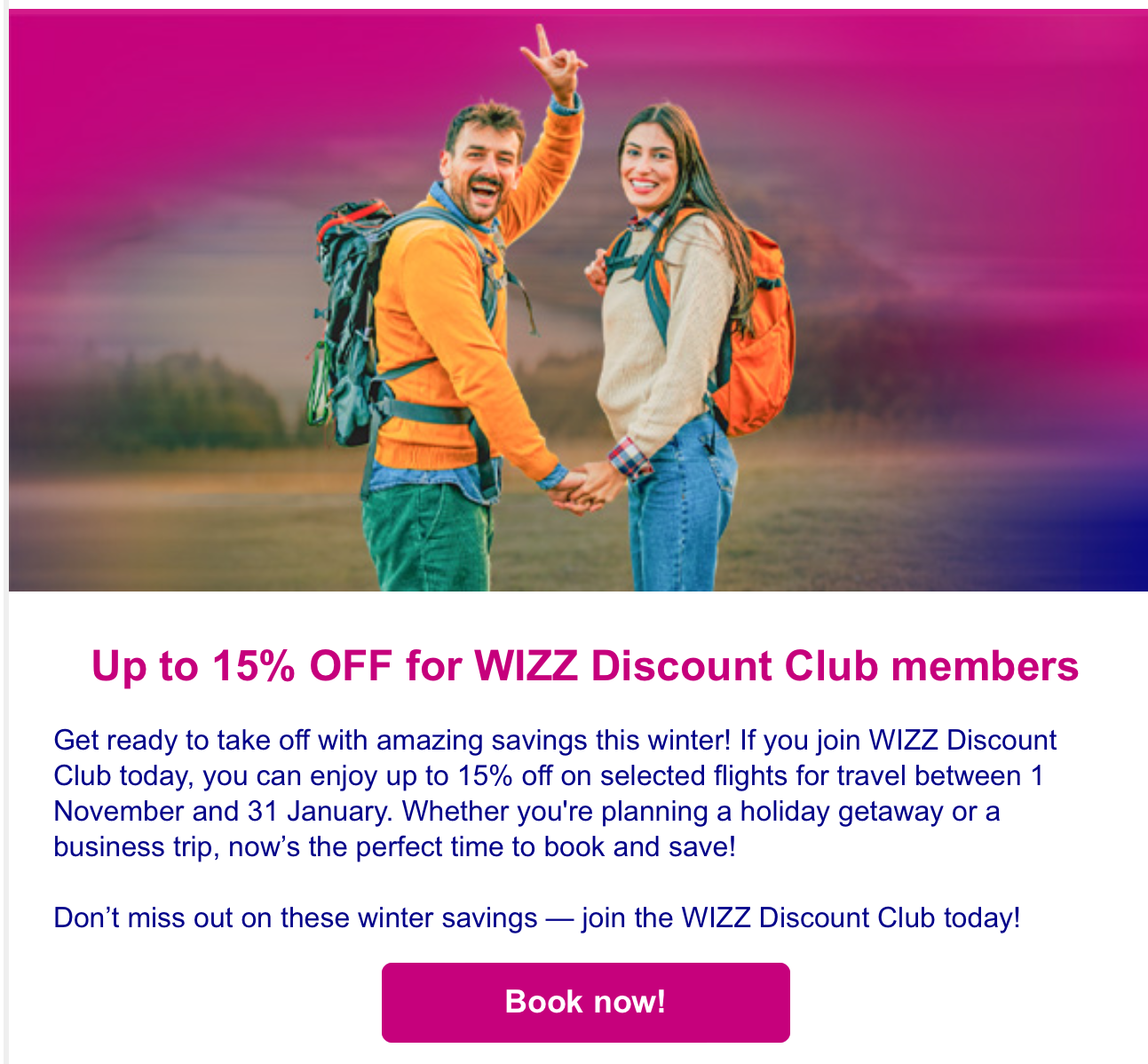 Пригответе се да излетите с невероятни спестявания тази зима! Ако се присъедините към WIZZ Discount Club днес, можете да се насладите на до 15% отстъпка за избрани полети за пътуване между 1 ноември и 31 януари. Независимо дали планирате ваканционно бягство или бизнес пътуване, сега е идеалният момент да резервирате и да спестите!