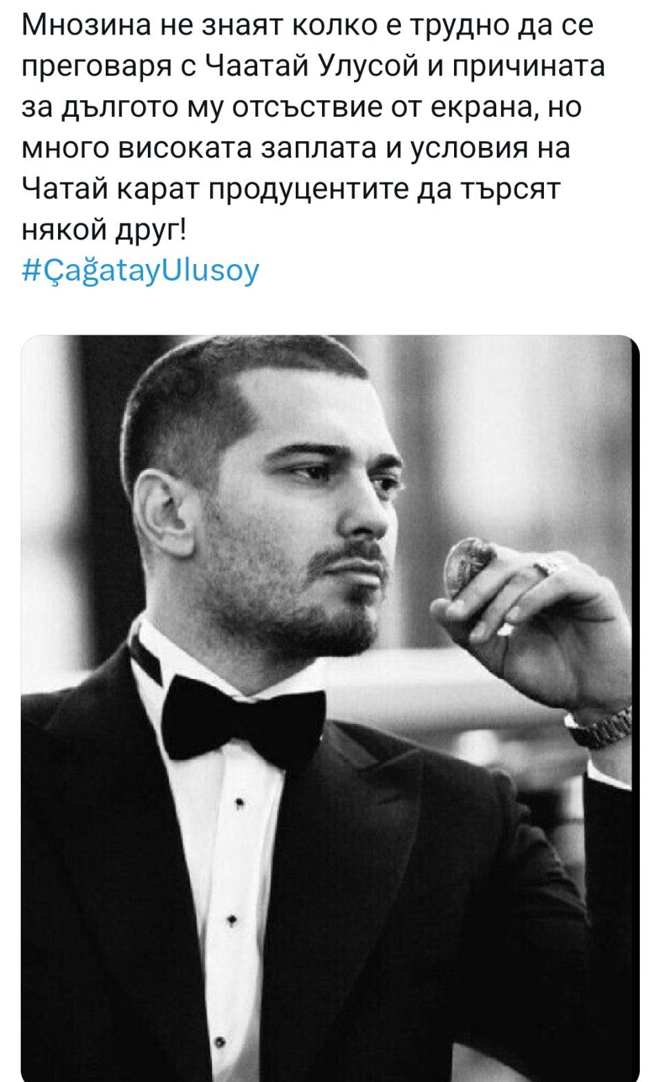 Колкото до Чаатай, аз също мисля, че при него не е въпрос на пари, но в същото време си знае цената. От това, което съм видяла до момента съдя, че за него предизвикателството от различните роли е на първо място.