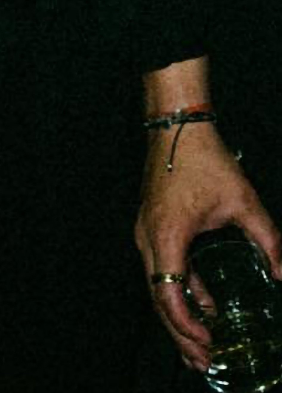 От новата снимка първо видях чашата. Тя не е от аксесоарите обаче. Сега се вижда халка на показалеца и кожена гривна.
