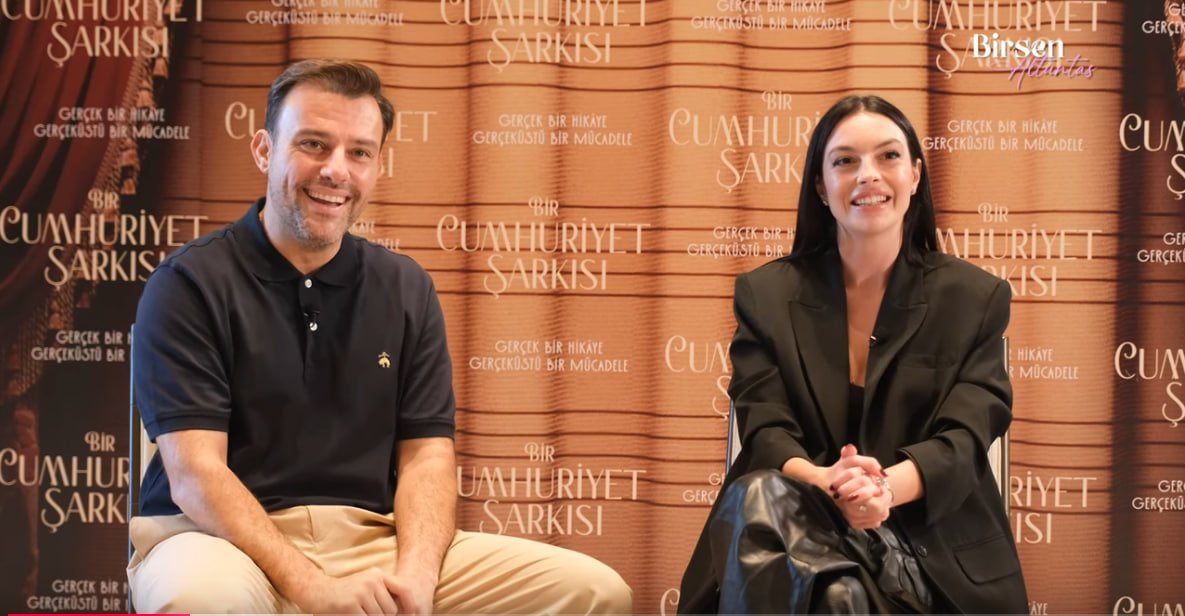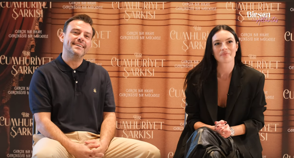 Салих Бадемджи, Мелис Сезен, Бирдже Акалай, Ертан Сабан и Ахмет Ръфат, кадри от интервю по повод премиерата на Bir cumburiyet şarkısı /Една песен на републиката.