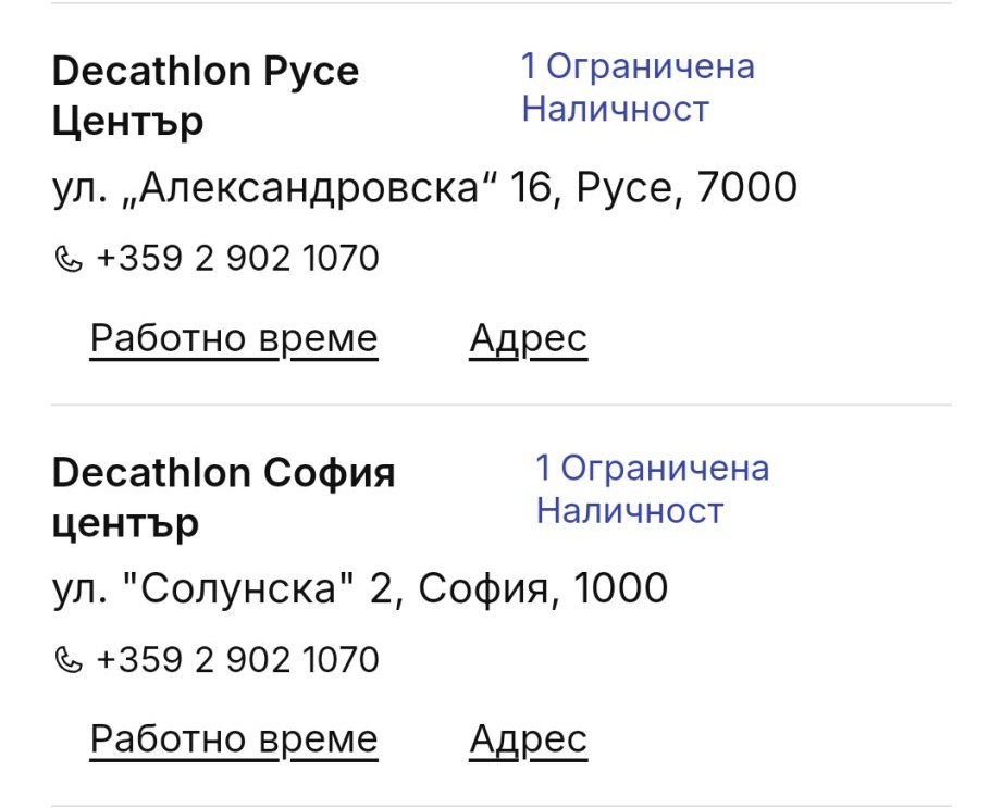 Здравейте, аз влизам с една молба тук, търся едни детски пантофи от Декатлон, но номера, който ми трябва го има само физически в два магазина.. един в Русе и един в София... Сега ще пусна адресите, та да помоля, ако някой живее близо дали би ми купил и пратил за една малка госпожица... Предварително благодаря!