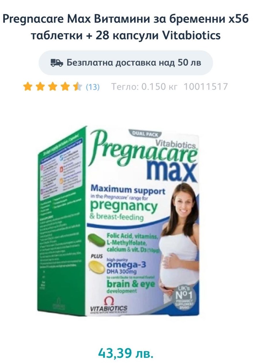 До края на първи триместър пих Prenatal Denk по препоръка на репродуктивния специалист. Сега проследяващият, при когото ходя, каза от началото на втори триместър да ги заменя с Prenatal Denk + DHA или Pregnacare + Omega3. Избрах Pregnacare, защото имат повече неща в състава.
