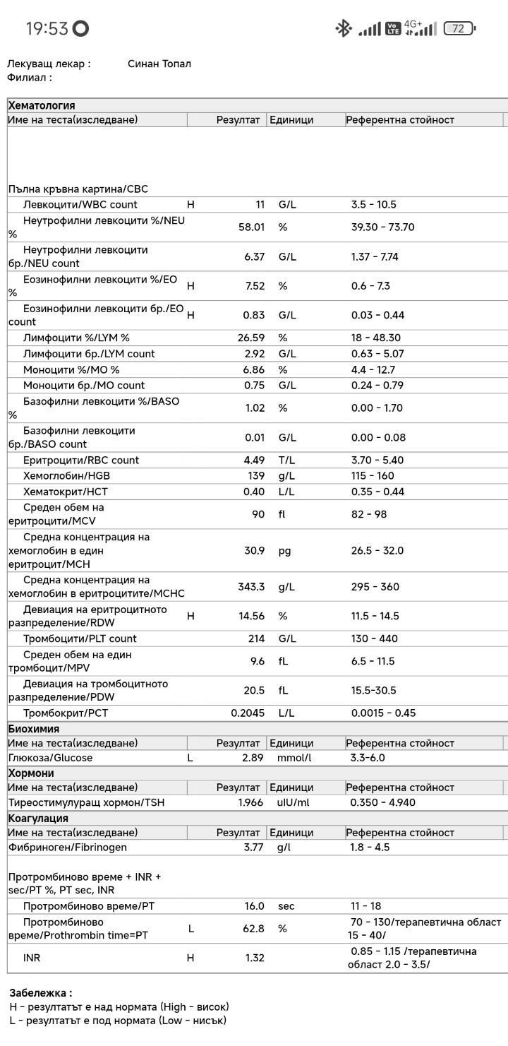 Здравейте, момичета! Бихте ли погледнали резултатите ми от днес? Протромбиновото време ме притеснява... Досега съм пускала в друга лаборатория с други референтни стойности. Благодаря предварително!