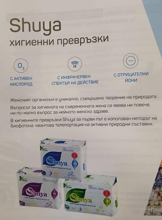 За жалост нямам вече снимката от каталог с разни продукти от сорта на Орифлейм, само че на някаква друга фирма. Там имаше дамски превръзки, които с квантова телепортация и инфраред прехвърляха наночастици директно от превръзката вътре във вагината и лекуваха гъбички и възпаления, и облекчаваха менструалните болки 😆😆