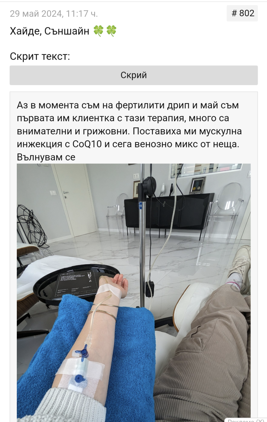 Не мога да кажа че е заради вливките, самия д-р ми обясни, че те са само спомагащо средство и не можем да разчитаме на чудо от тях, но поне след вливката се чувствах добре - отнема около 1 час, час и малко даже май беше, усещаш затопляне и ти става леко замаяно, но приятно. При мен бяха направили някакъв коктейл от неща според изследванията и това какво се препоръчва за фертилитет - имаше глутатион в нея със сигурност, като него май ми го биха като инжекция, или се бъркам, може би беше нещо друго, пак силен антиоксидант.