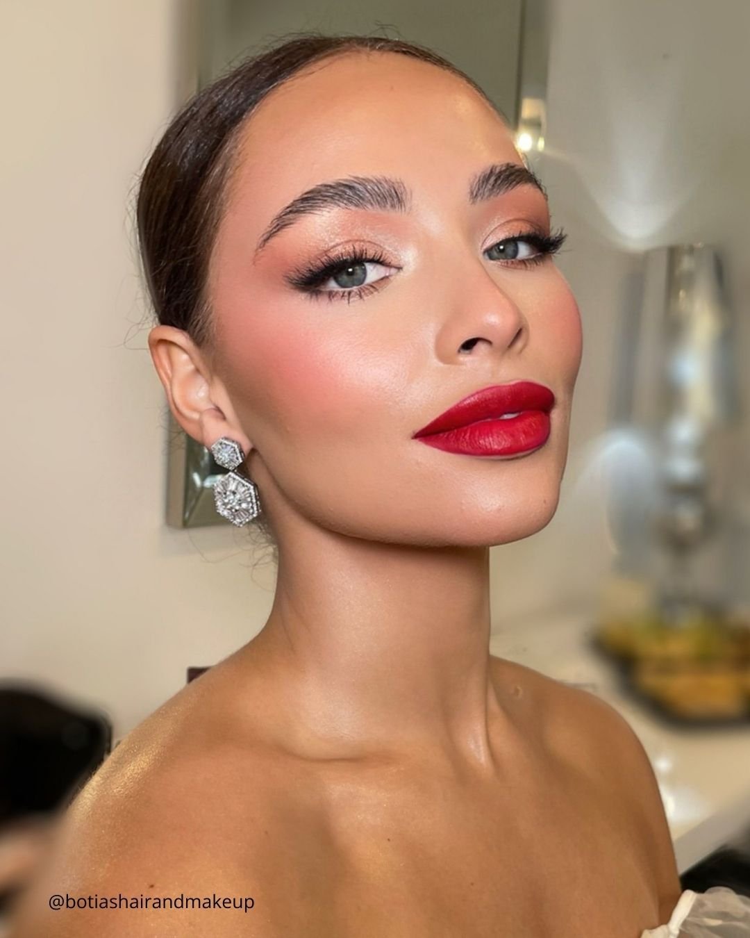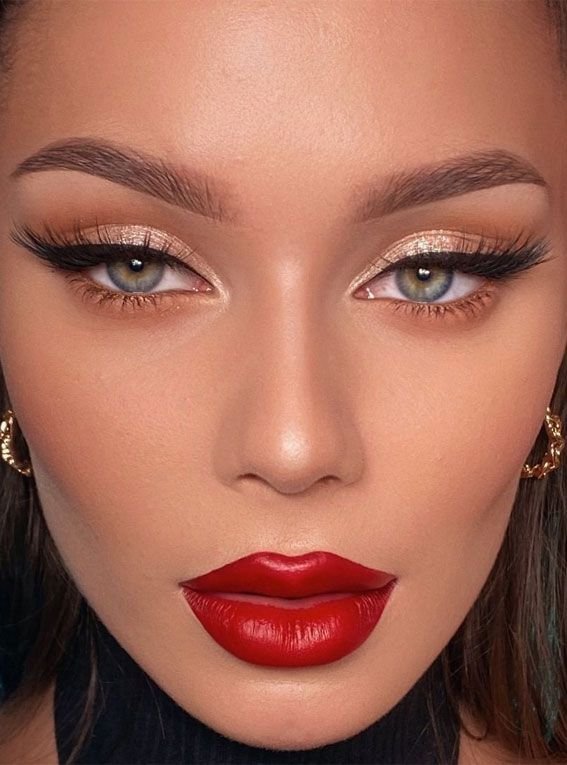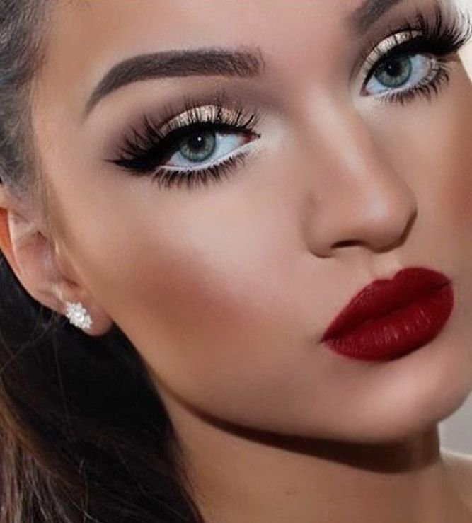 Aз съм за червеното червило, не само защото е празнично. Като цяло бяла кожа червена коса и черна рокля изискват по вамп грим, така че бих сменила сенките по-скоро.