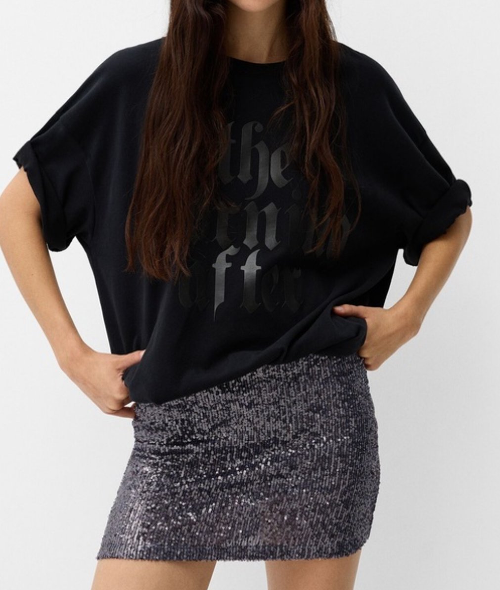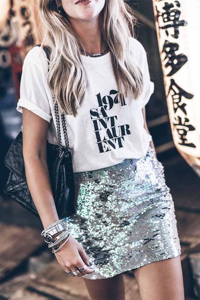 Аз имам черна тениска с черни пайети(цялата е с пайети) и я нося с черни по-балонести дънки. Носила съм я и със сив широк панталон с много висока талия.
