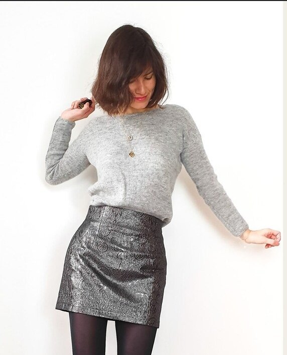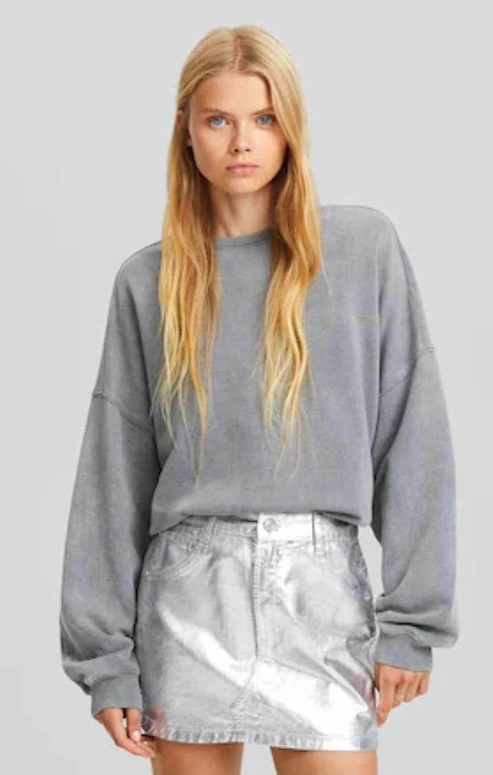 Другото, с което я виждам конкретно тази пола, е матов тънък полу-прозрачен сив чорапогащник и сив оувърсайз пуловер, ако ви се намира такъв. Нещо подобно: