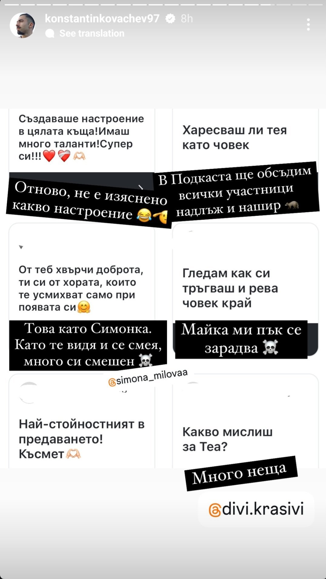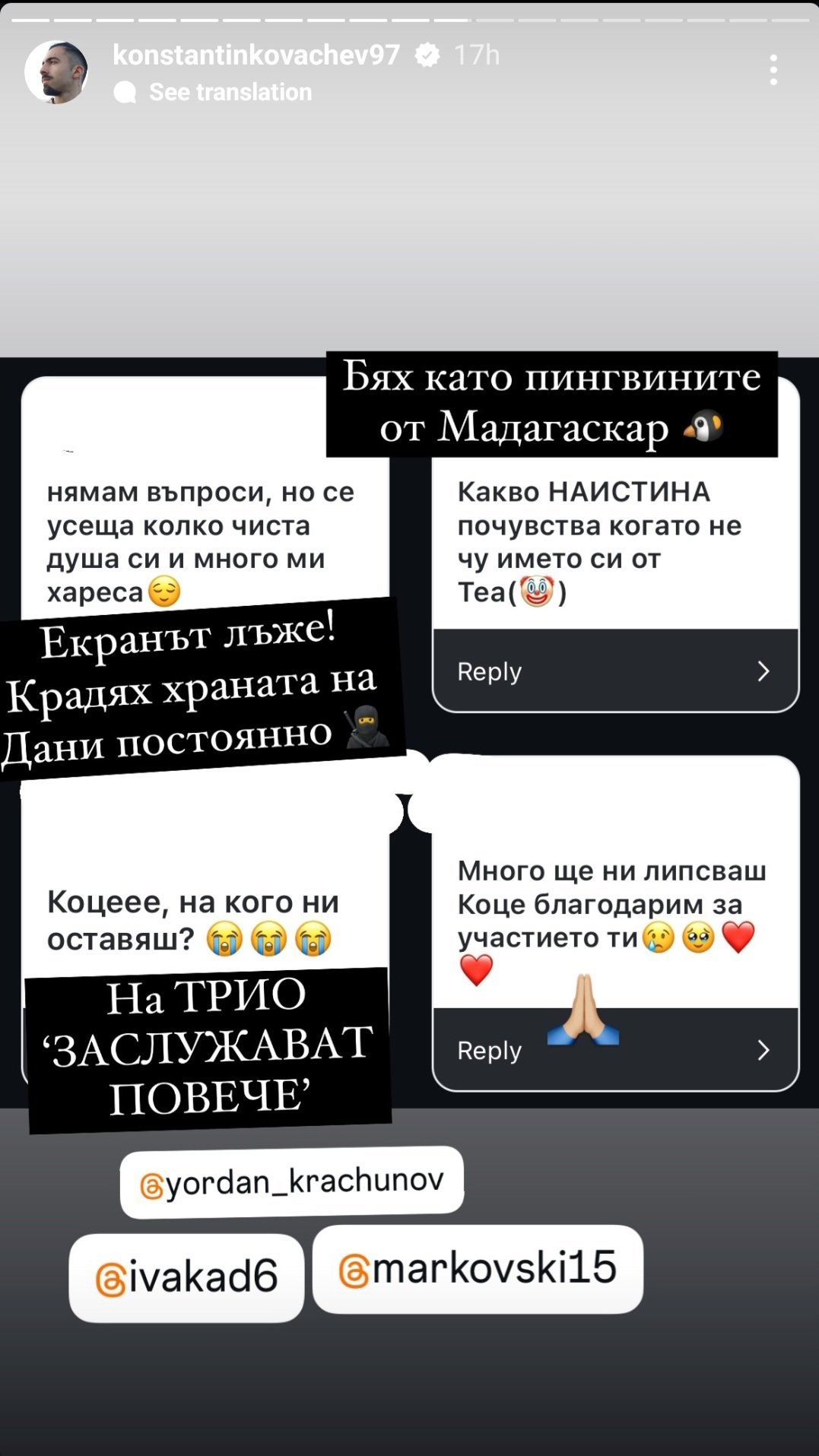 Коцето - на едно място е отговорил, че изпитва съжаление към Теа, на останалите, че ще каже повече в подкаста. Направи ми впечатление коментарът "трио заслужават повече" 😂