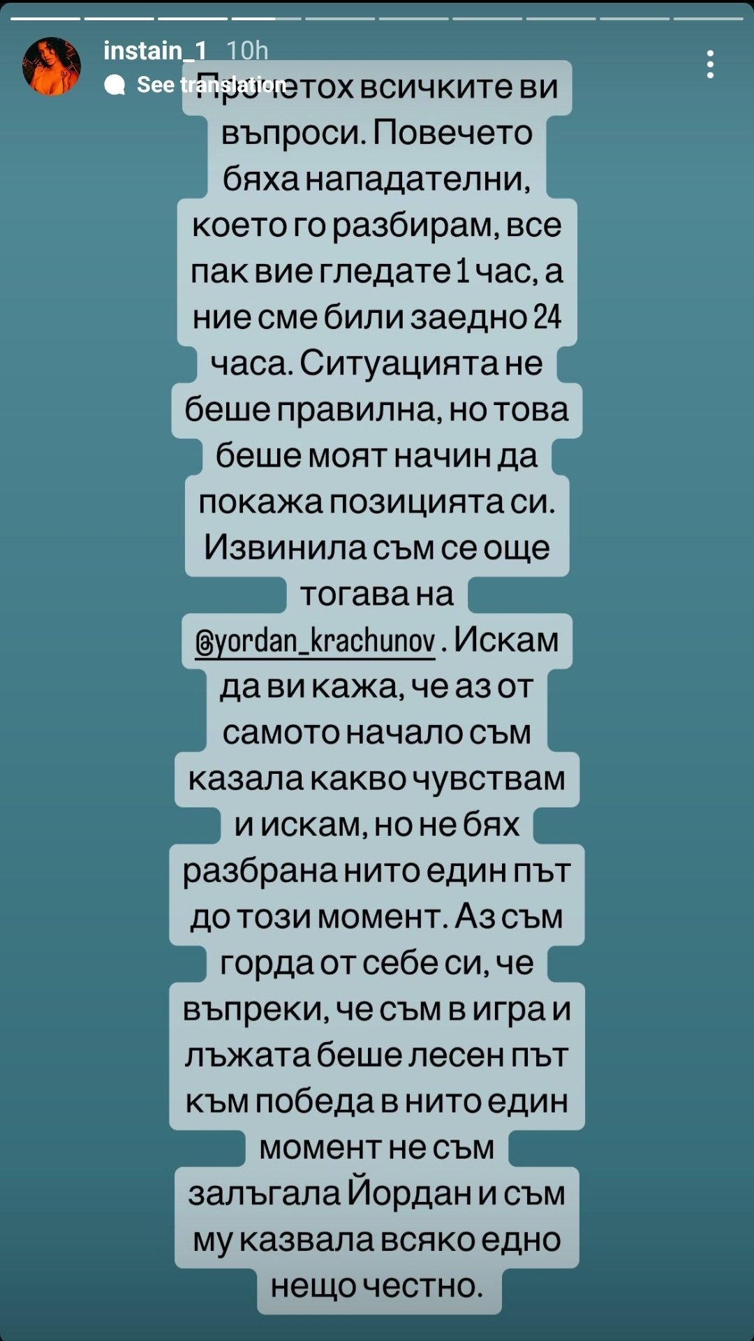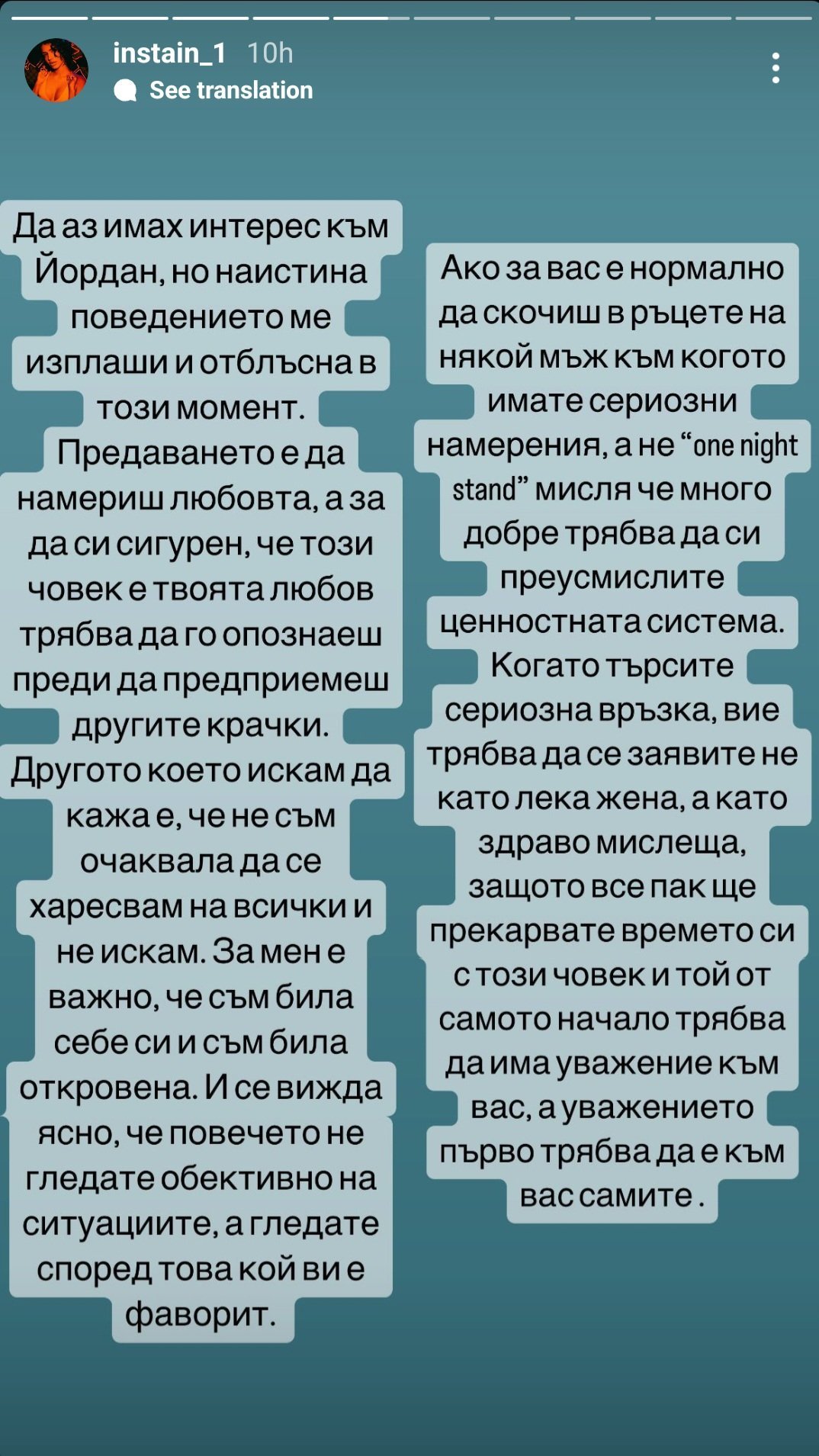 Познавала съм човек като Йордан и наистина като не ставаше на неговата , а той наистина насила целеше да се случат нещата и после говореше гадости за мен. Така, че от една страна наистина той има проблем, твърде първичен е и някак си иска да превъзхожда някого. Обаче, че Ина не е готова, поне с него да се впусне в нещо, не е. Или не го хареса външно, или наистина е влязла за слава и понеже той й каза неща, които са били само в главата й и тя съвсем се отдръпна. Факт е, че който постоянно ти натяква нещо, ти все повече ще бягаш от него. А пък Тея на интрото плачеше, явно Симеон ще я изгони на следващите елиминации