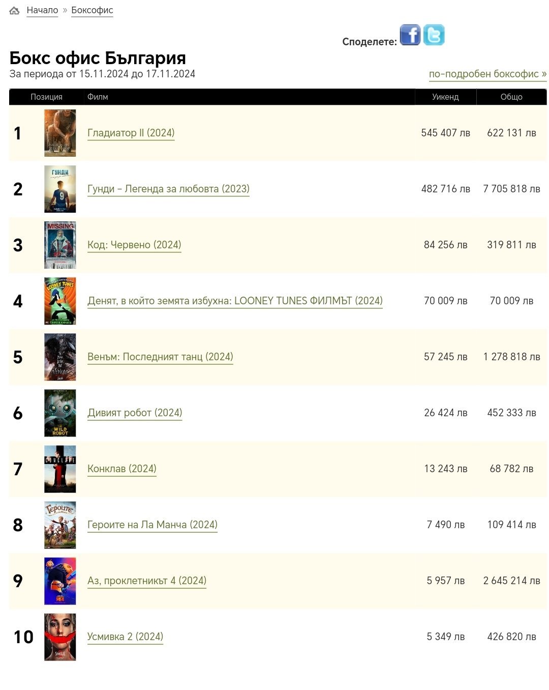 Гладиатор 2 детронира от първо място "Гунди". Ето класацията за изминалия уикенд: